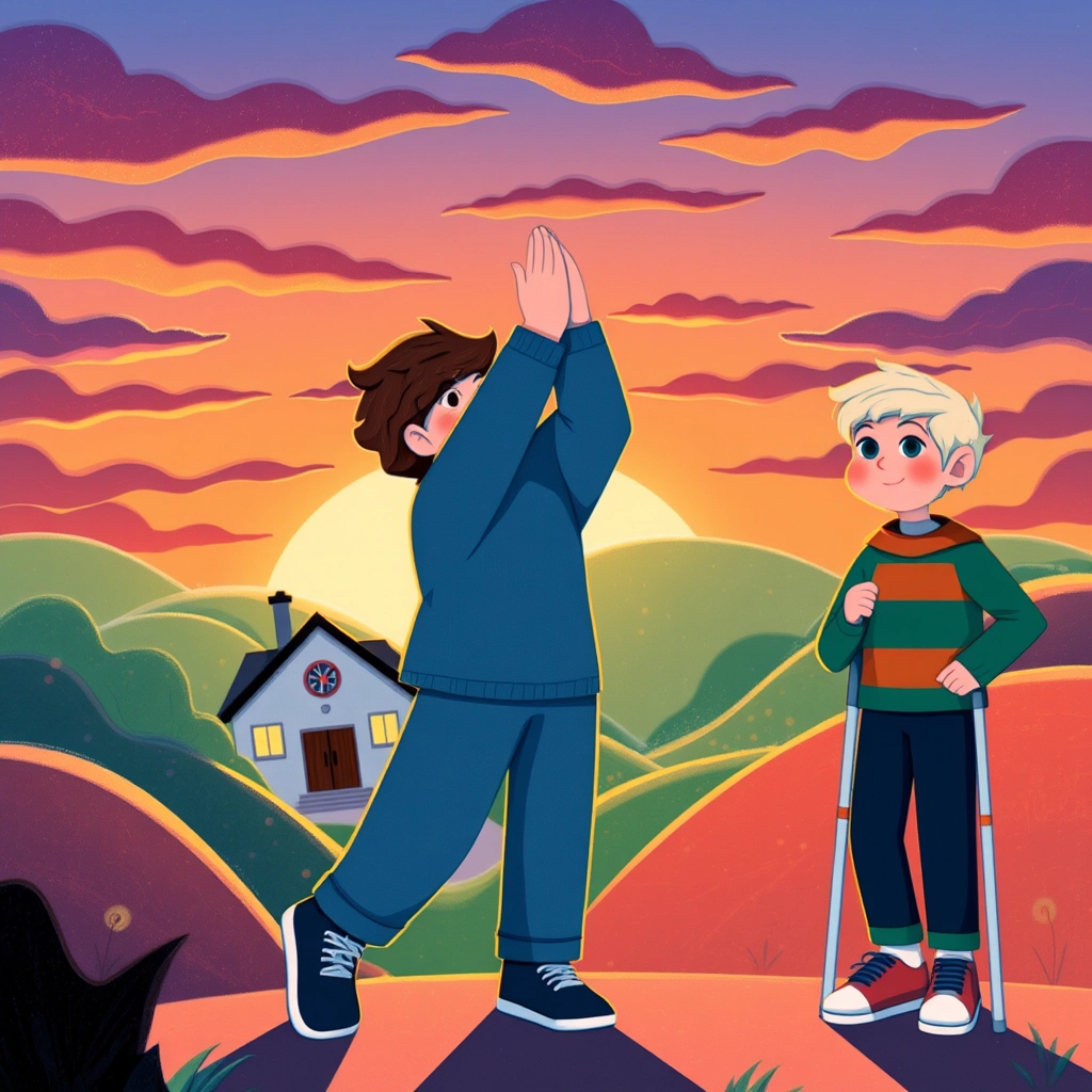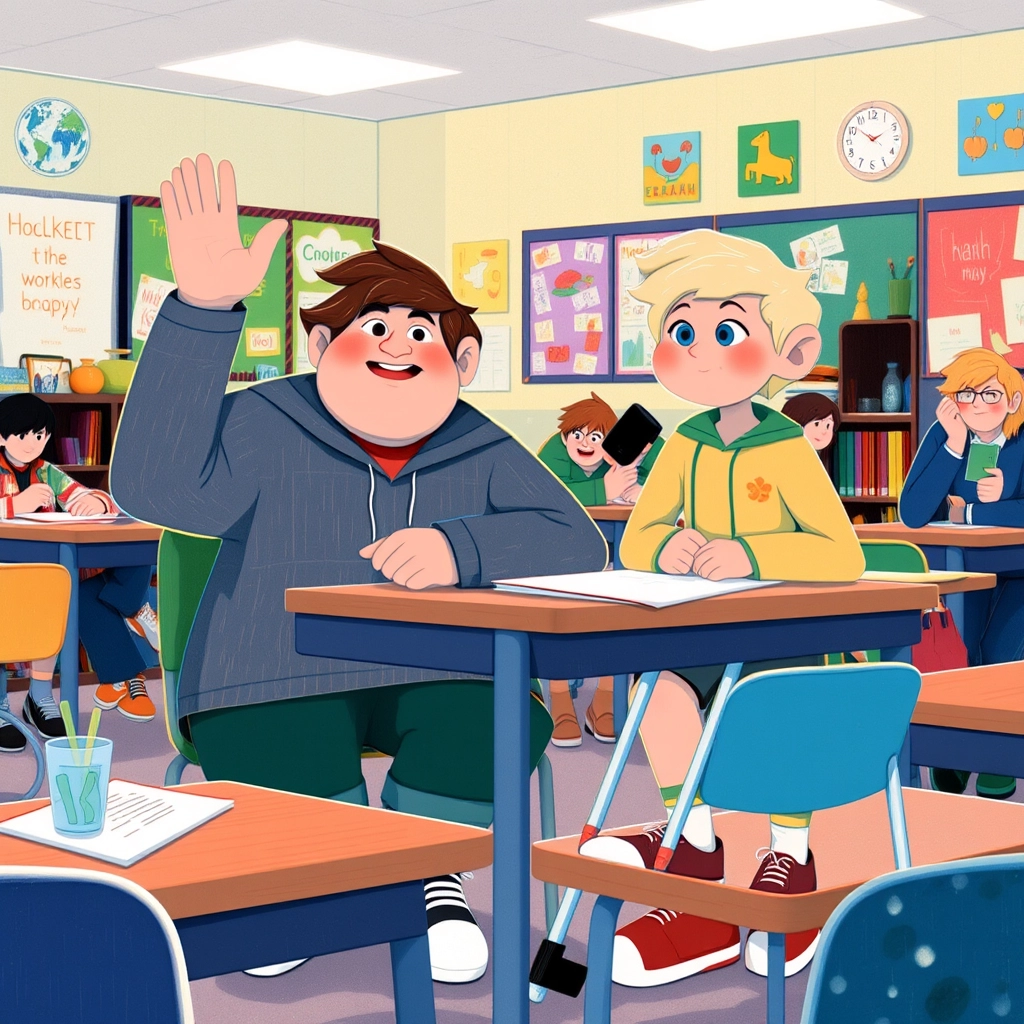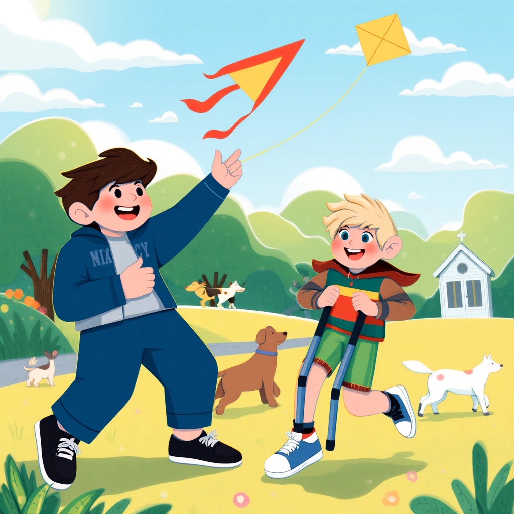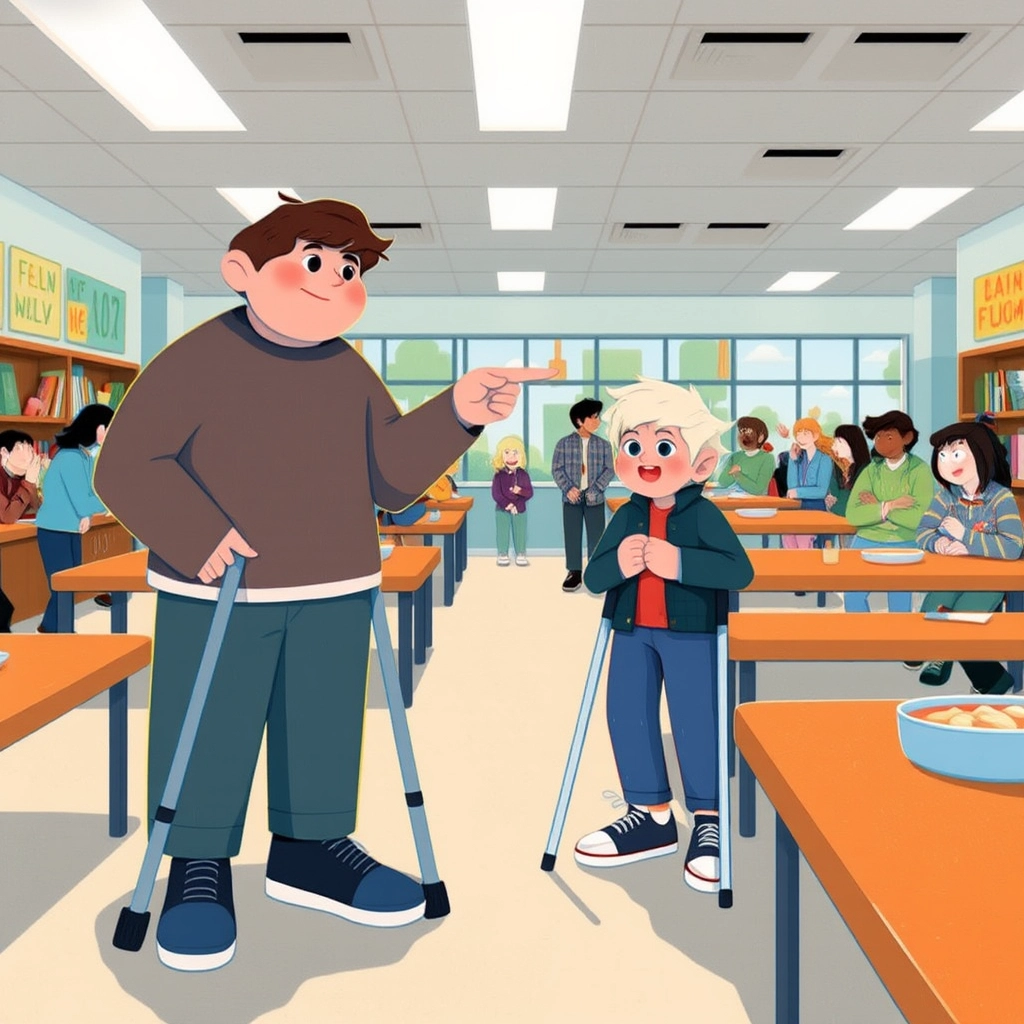 One day, while walking to school, [Max](9KPFB49P) spotted a familiar face. It was [Freak](B4MG67JS)! He remembered him from daycare—the kid with the leg braces and fierce determination in his eyes. [Max](9KPFB49P) had been angry back then, but [Freak](B4MG67JS) didn’t seem to mind.