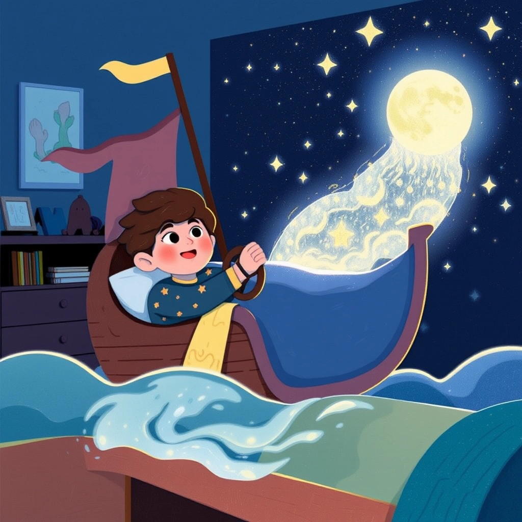 As soon as [Max](XWK9KCLT) closed his eyes, the room around him transformed. His bed turned into a flying pirate ship, and the stars outside started to twinkle like fairy lights.