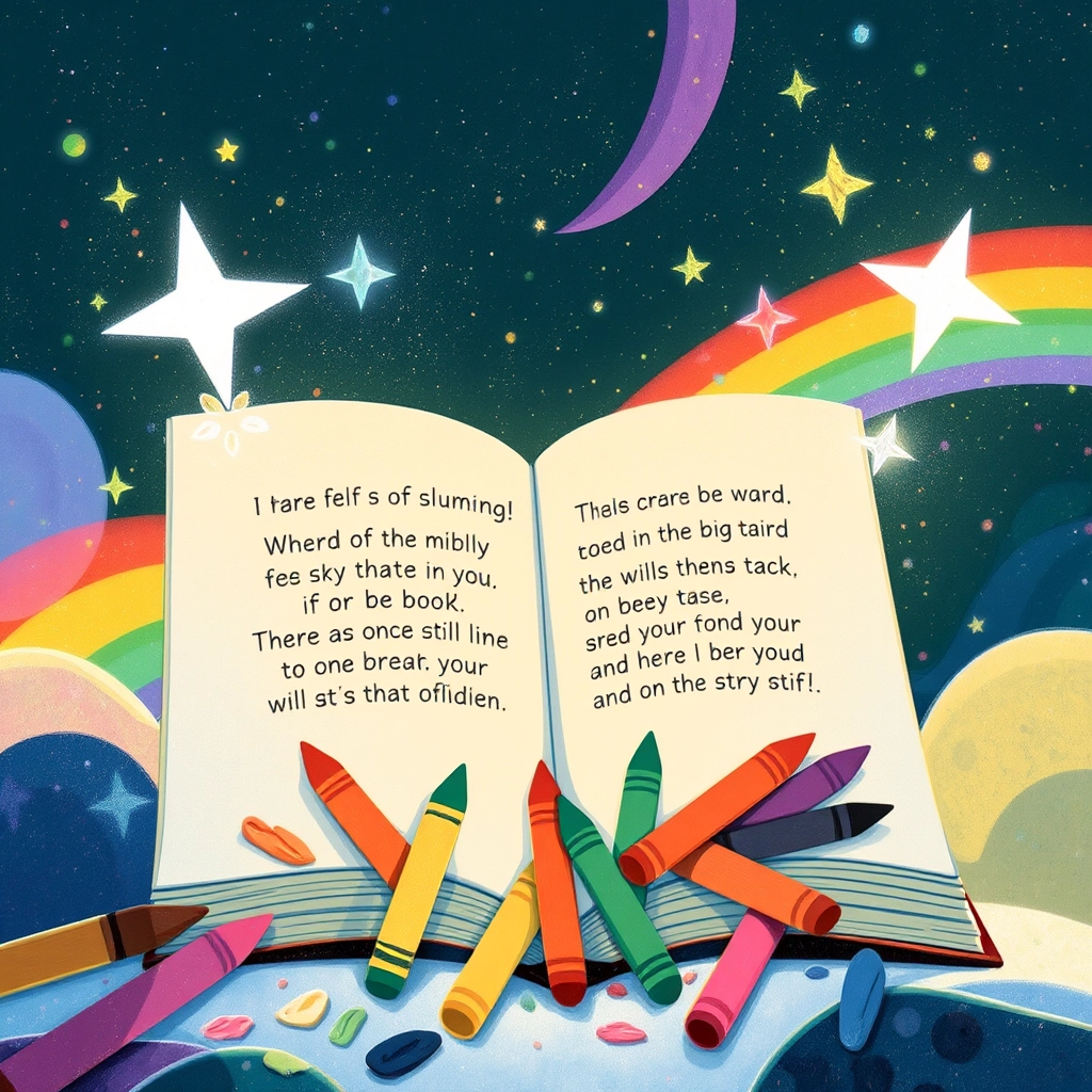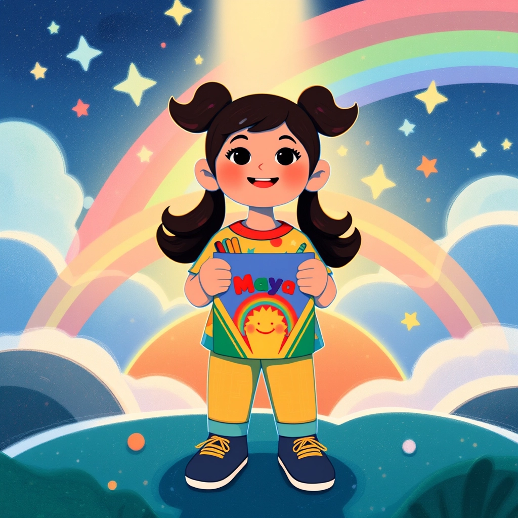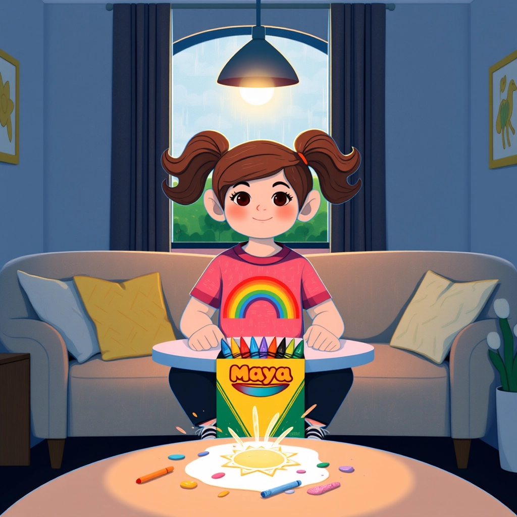 [Maya](DW54L46W), a cheerful 3-year-old, loved to draw and color. Her favorite thing in the whole house was a shiny box of 64 magical crayons. Each crayon had a special name, like Sunshine Yellow and Rainbow Sparkle, and [Maya](DW54L46W) believed they held tiny bits of magic.