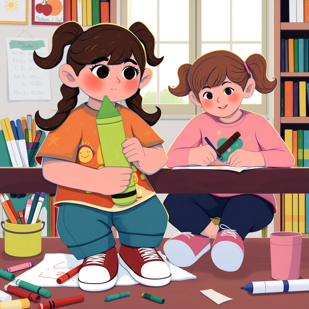 [Maya](DW54L46W) hesitated and clung to her shiny green crayon. She whispered, ‘I don’t want it to get small. Maybe later.’ [Mira](WY64HCPC), disappointed but kind, reached for a dull brown marker instead.