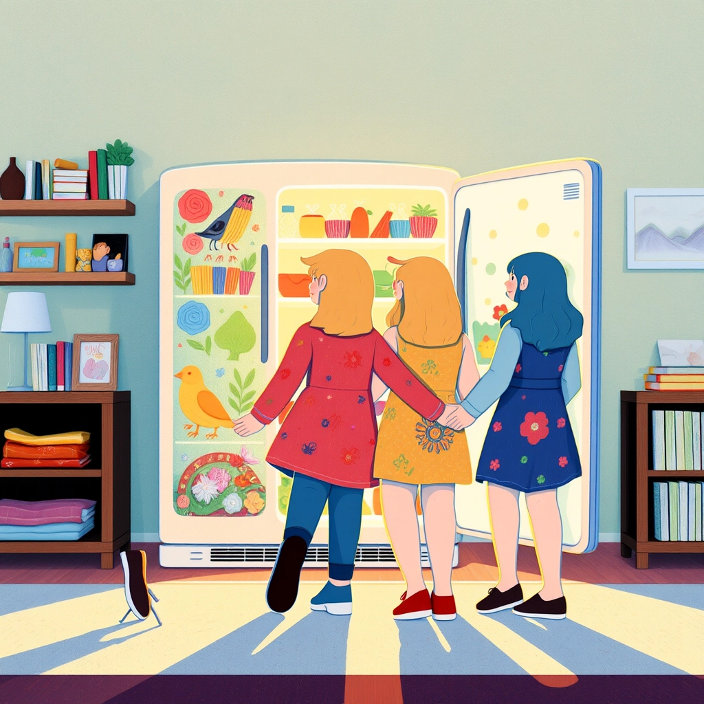 Later, all three sisters taped their drawings to the fridge. [Maya](DW54L46W)’s picture was bright and colorful but felt lonely. [Mira](WY64HCPC) and [Viya](XXC24ZFQ)’s shared garden scene, on the other hand, was full of smiling clouds and laughter.