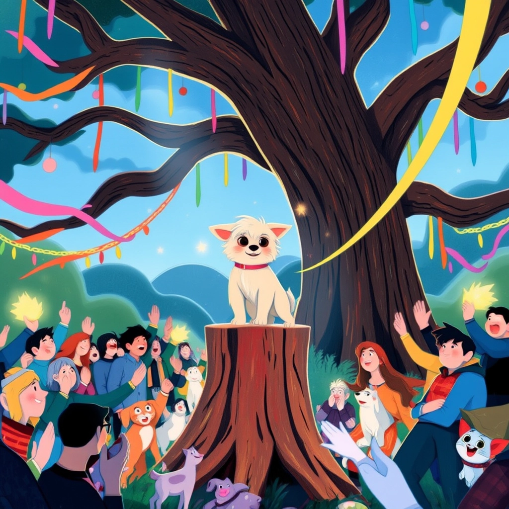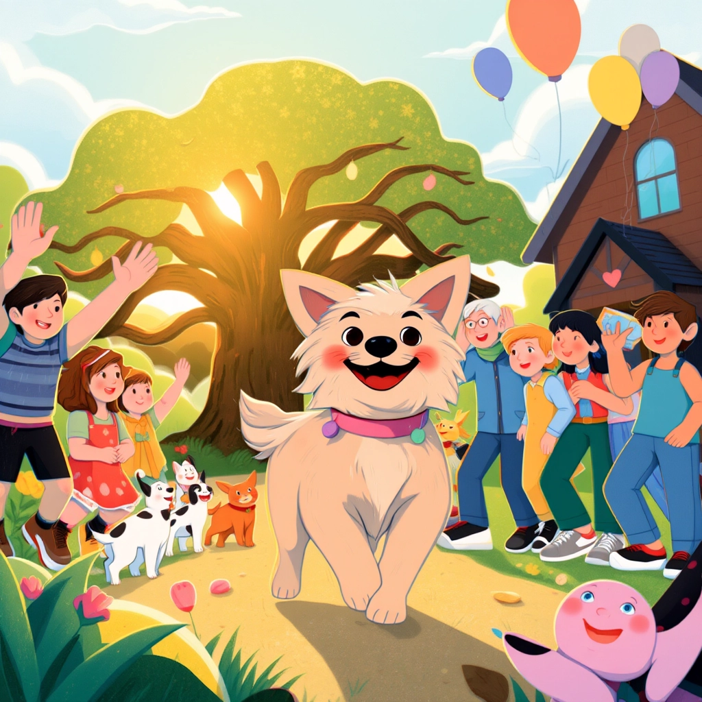 As [Meeka](LC2MHCTH) reached the big oak tree at the edge of town, all his neighbors, furry and human, had followed him there. They clapped, barked, and cheered, ‘Hip hip hooray for [Meeka](LC2MHCTH), the kindest and happiest dog in town!’