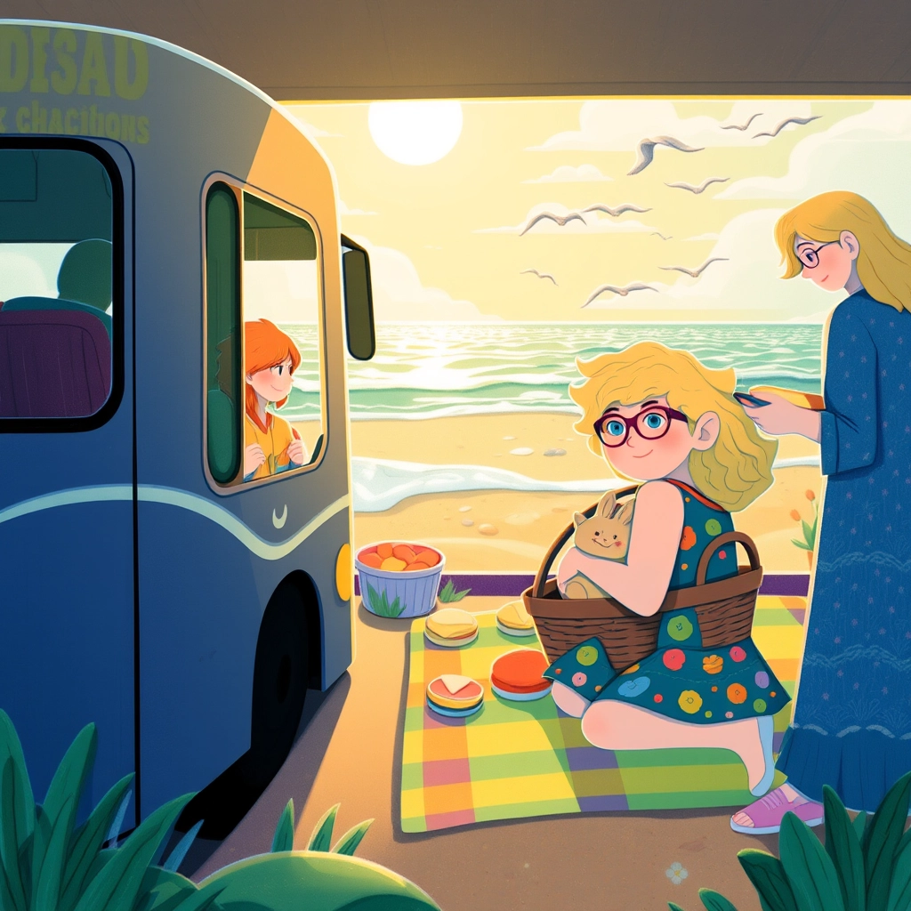 They took a bus to the beach, and the day was perfect! The blue sky stretched endlessly, and the waves gently lapped against the shore. They laid out their colorful picnic blanket, and [Megan](D5DGHW6Z) helped unpack the yummy food. While Mum looked at the food, [Megan](D5DGHW6Z) carefully took out Mr. Bunny and kept him behind her back, out of sight.