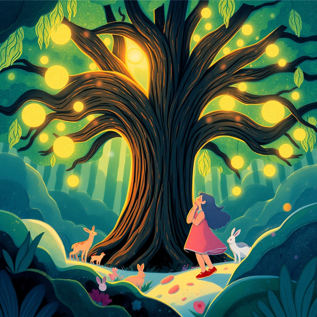 Она пошла по тропинке, пока не увидела дуб с золотыми листьями. Дуб тихо светился, а листья переливались всеми цветами радуги.