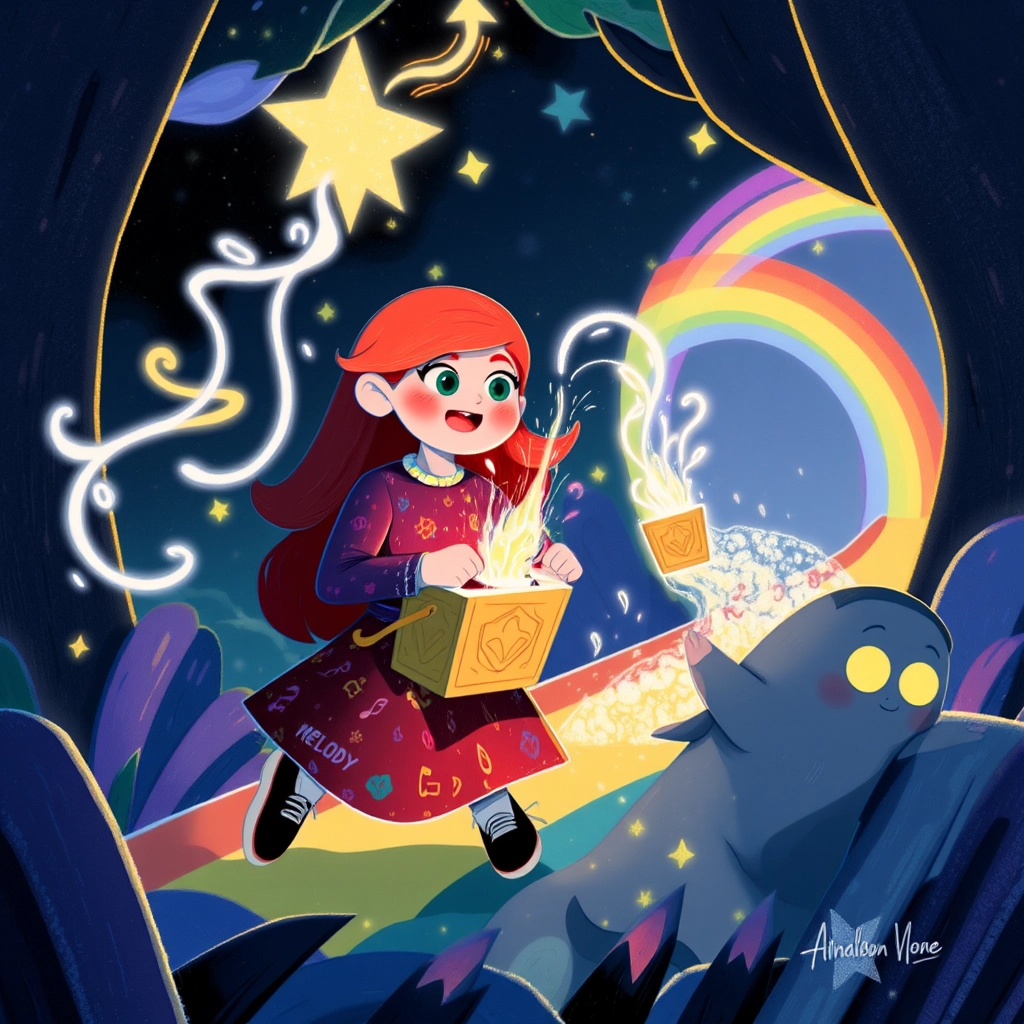 [Melody](9TG7JWPR) opened the box once more, and her voice returned with a burst of melody and harmony! 'Oh, I can sing again!' she said, embracing her joy as the gray creature appeared looking apologetic and returned to its home.
