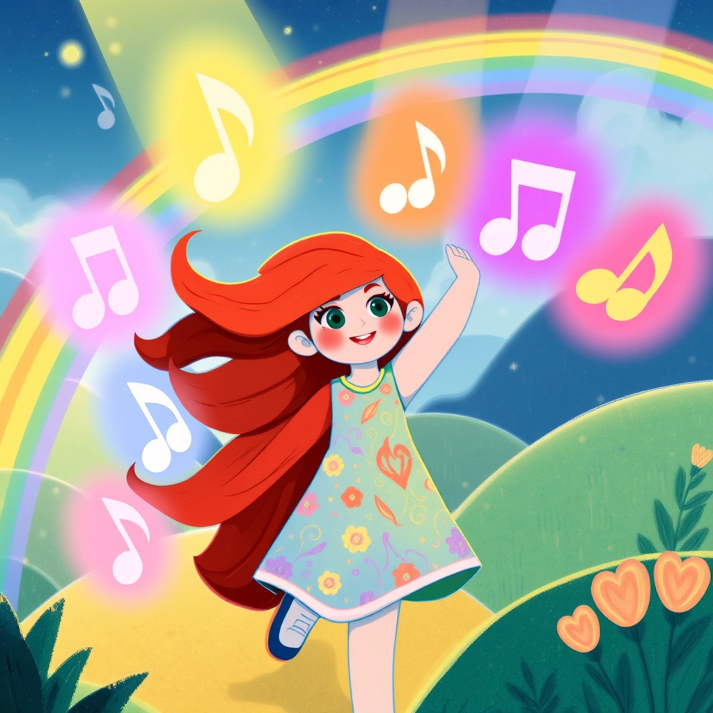 [Melody](9TG7JWPR) followed the road and soon met the seven musical notes, each with its own glow and color, like the rainbow. Notes C through B sang in harmony and guided her to take a left onto Red Street and a right onto Orange Avenue.