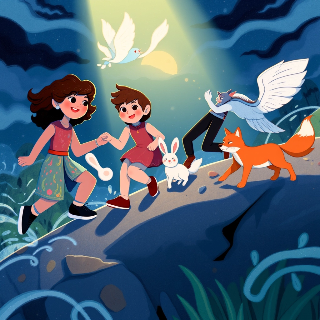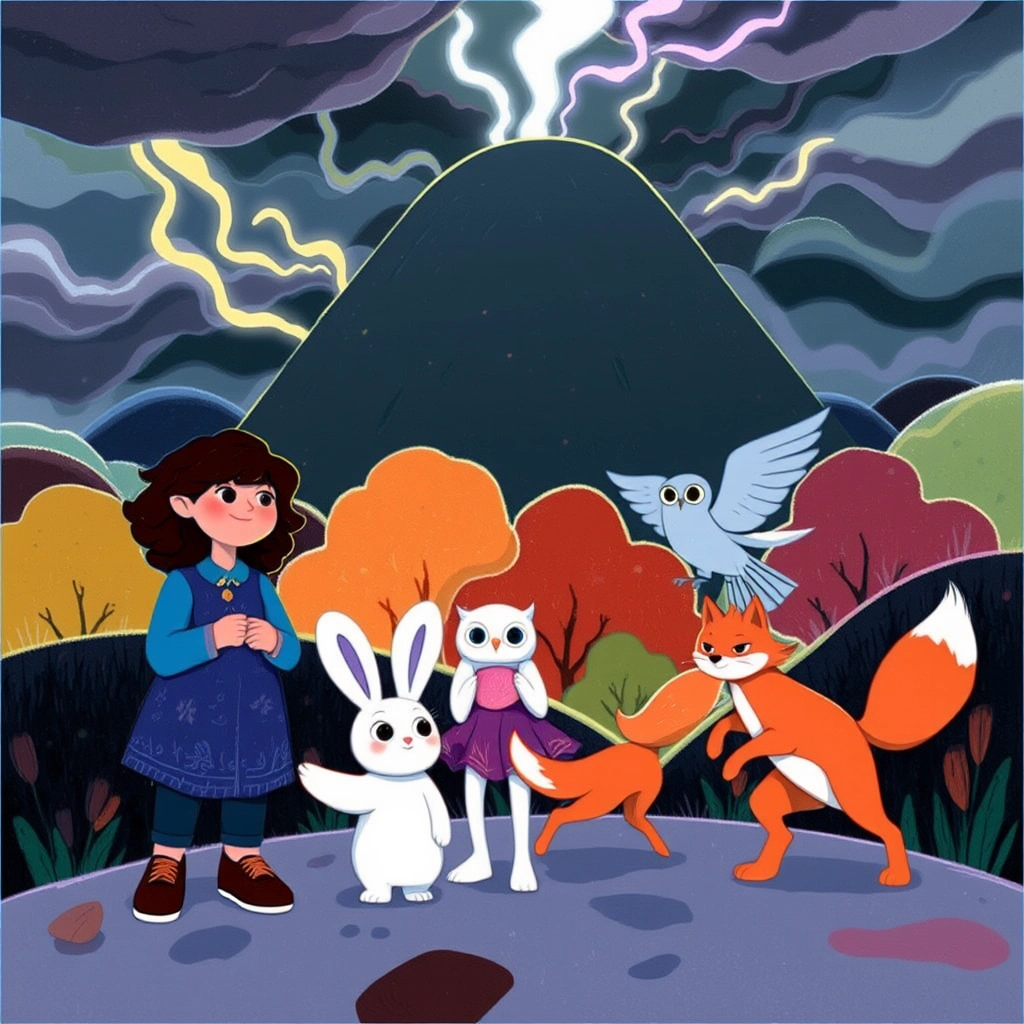 But the island was in trouble! The Rainbow Crystal that kept Rainbow Island shining bright had vanished. The friends learned it was at the top of Stormy Hill, a place with wild winds and loud thunder. [Bubbles](L773Q5W4)' ears drooped, [Luna](P4R3YJWL) fluffed her feathers, and [Finn](YPGRBRMQ)'s tail lost its bounce.