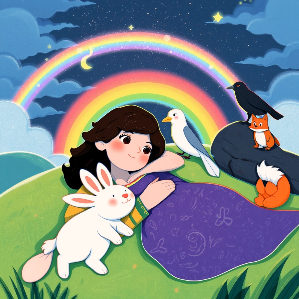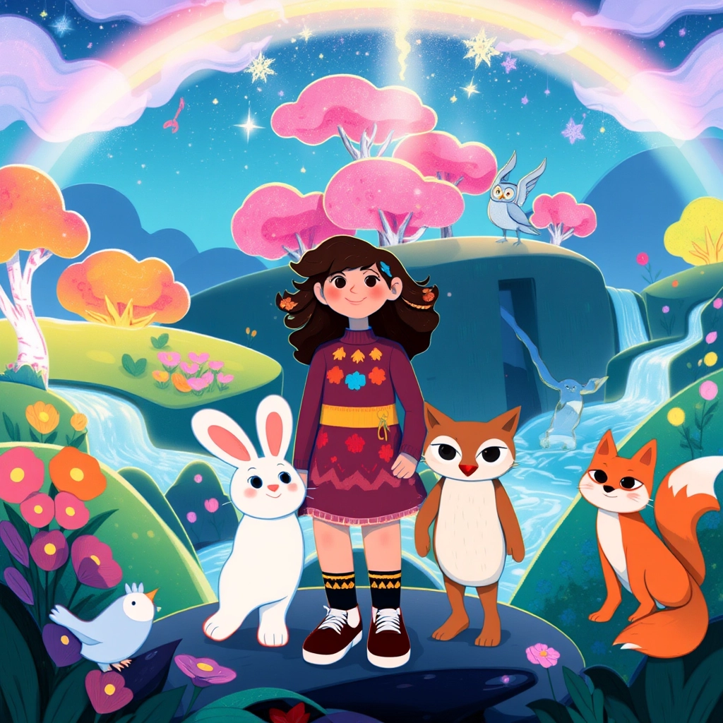When [Michelyn](V75HP5TB) arrived at Rainbow Island, her three best animal friends were waiting: [Bubbles](L773Q5W4), the fluffy white bunny; [Luna](P4R3YJWL), the wise silver-feathered owl; and [Finn](YPGRBRMQ), the playful orange fox. The island sparkled with glowing flowers, candy-colored trees, and streams that sang!