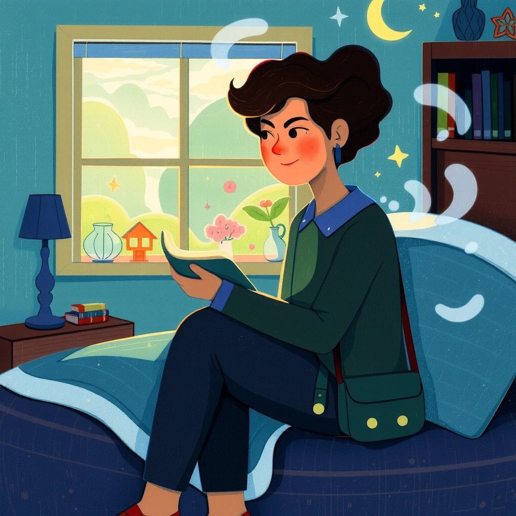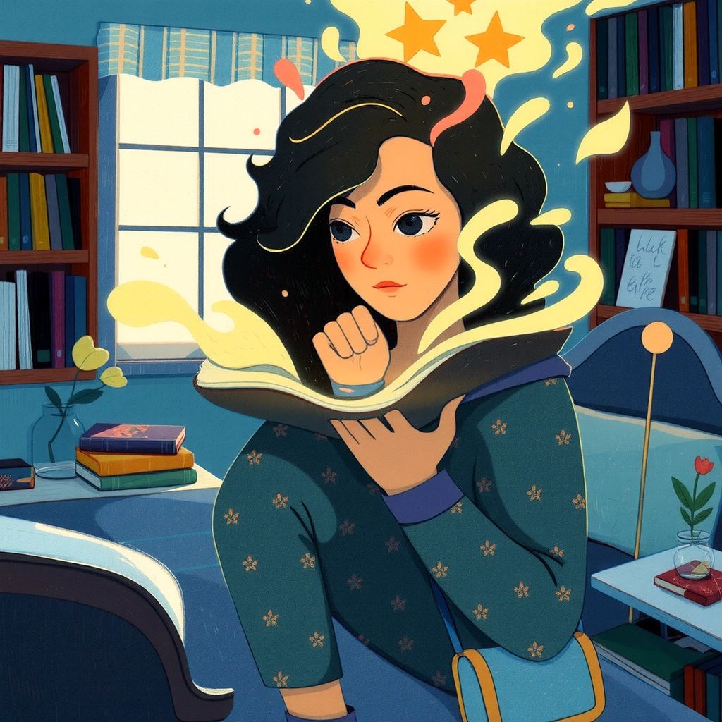 [Milena](XXNF5VDZ) was sitting in her cozy bedroom, surrounded by piles of books, when an ancient-looking book caught her eye. As she opened it, the words began to glow, and suddenly, she was pulled inside the book!