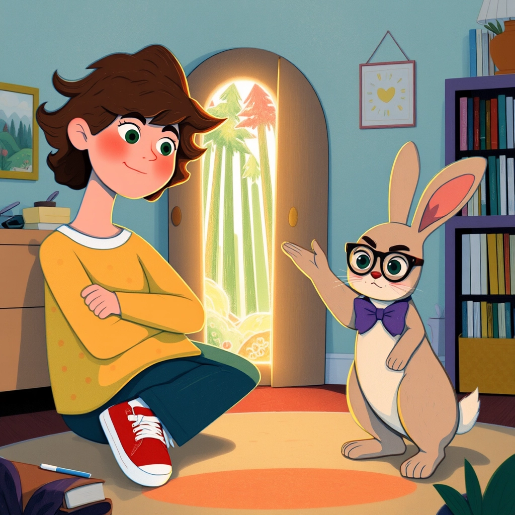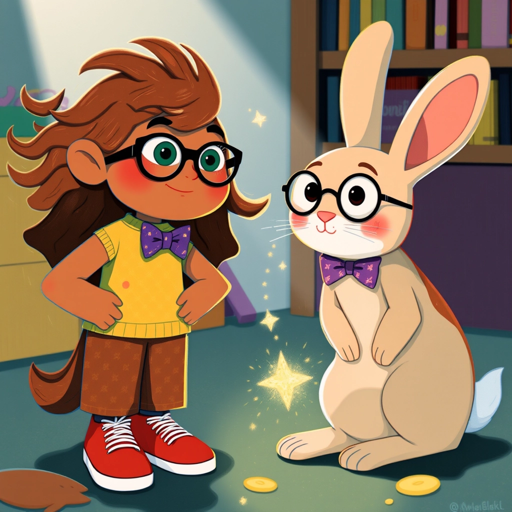 ‘Life isn’t fair!’ [Molly](H43S5C77) shouted. She plopped onto the floor and frowned so hard her cheeks puffed up. That’s when, out of the corner of her eye, she noticed something sparkly near the bookshelf. It was a teeny, tiny rabbit wearing glasses and a bowtie!