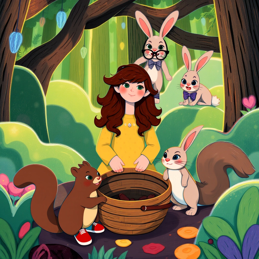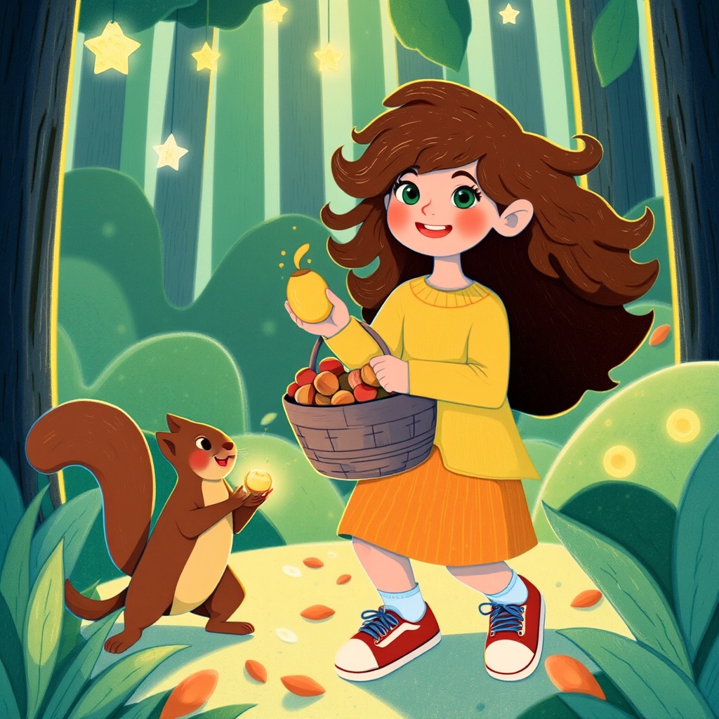 [Molly](H43S5C77) picked up acorns from under trees and near bushes, dropping them into the basket. ‘Here you go!’ she said with a big smile. The squirrels squeaked with joy and gave her the shiniest acorn as a thank-you gift.