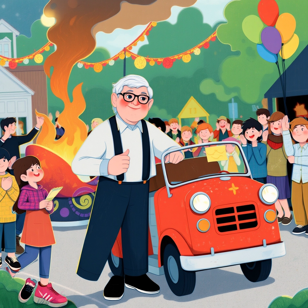 The fire was out, and everyone clapped and cheered. '[Rusty](PL3QBQV7) saved the day!' they shouted. [Mr. John](6DTKWMPY) beamed with pride, patting [Rusty](PL3QBQV7) gently on its hood.
