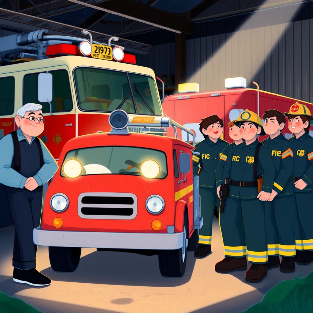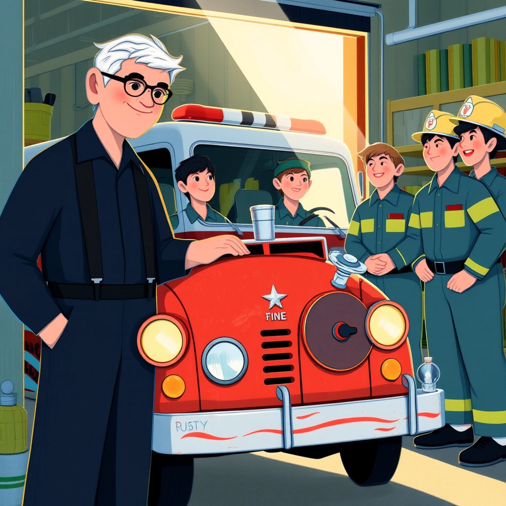 In a small, bustling town, [Mr. John](6DTKWMPY) woke up early every morning before the firehouse stirred to life. He grinned as he saw his old fire truck, [Rusty](PL3QBQV7), waiting for him in its familiar corner.