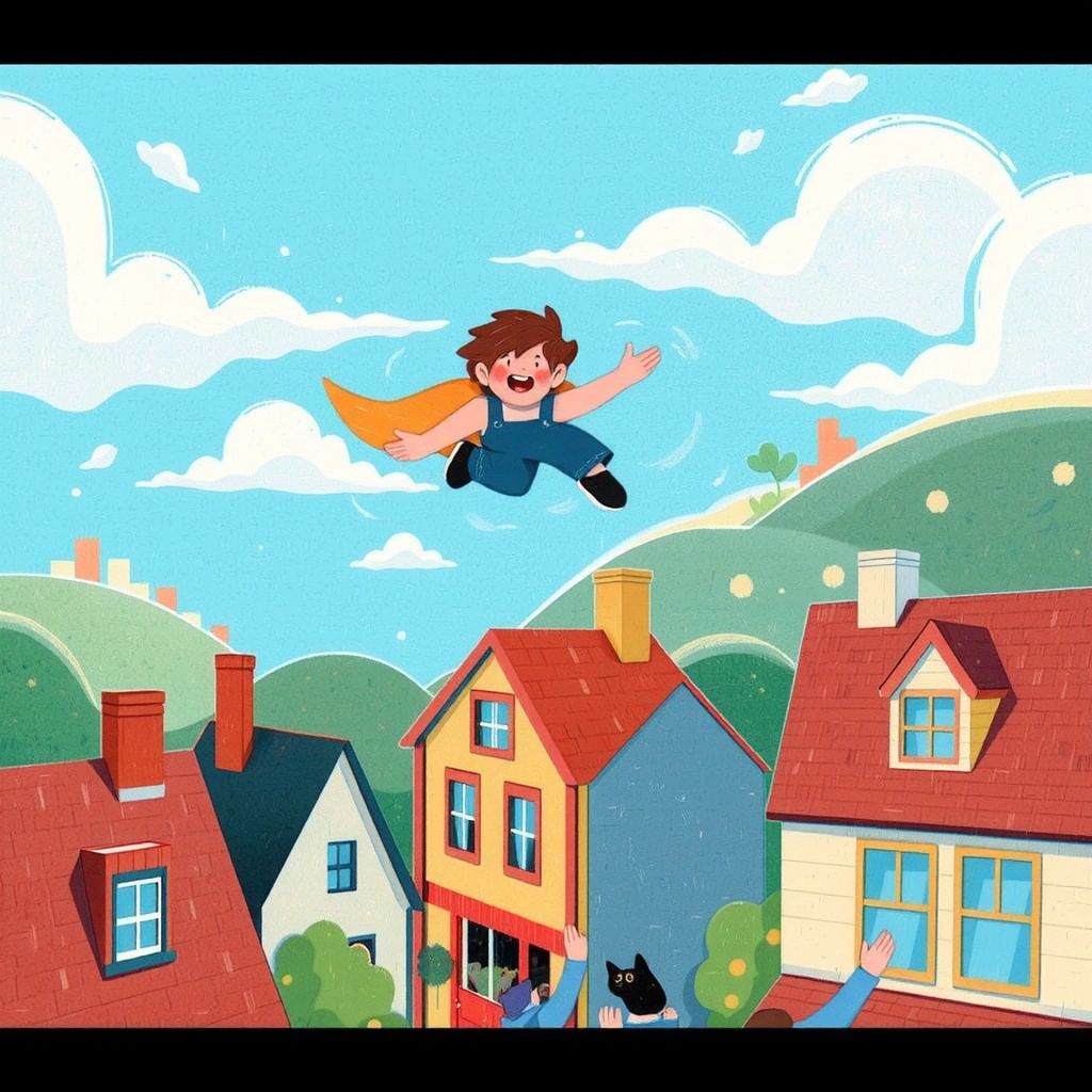 The ride was smoother than he imagined. [Muz](Y45K5HDB) soared above his neighborhood, catching glimpses of rooftops and tree tops. People waved cheerfully, amazed at the sight of a bicycle in the sky.