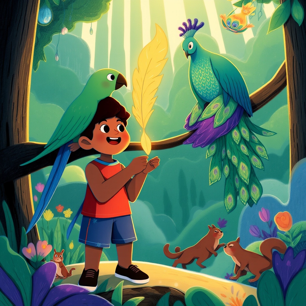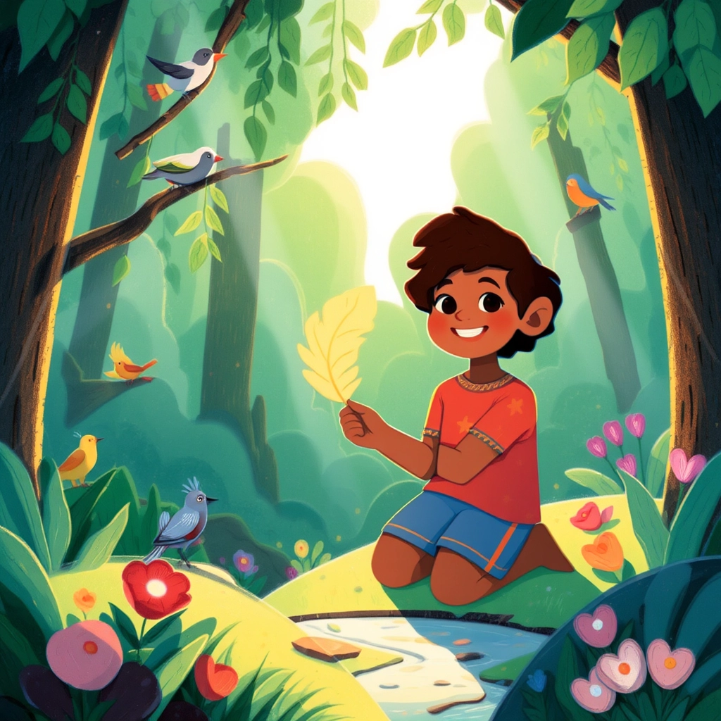 One day, while exploring the forest nearby, [Mwakhe](LP4XFKMF) found a sparkling, golden feather nestled in the grass. It shimmered like magic in the sunlight.