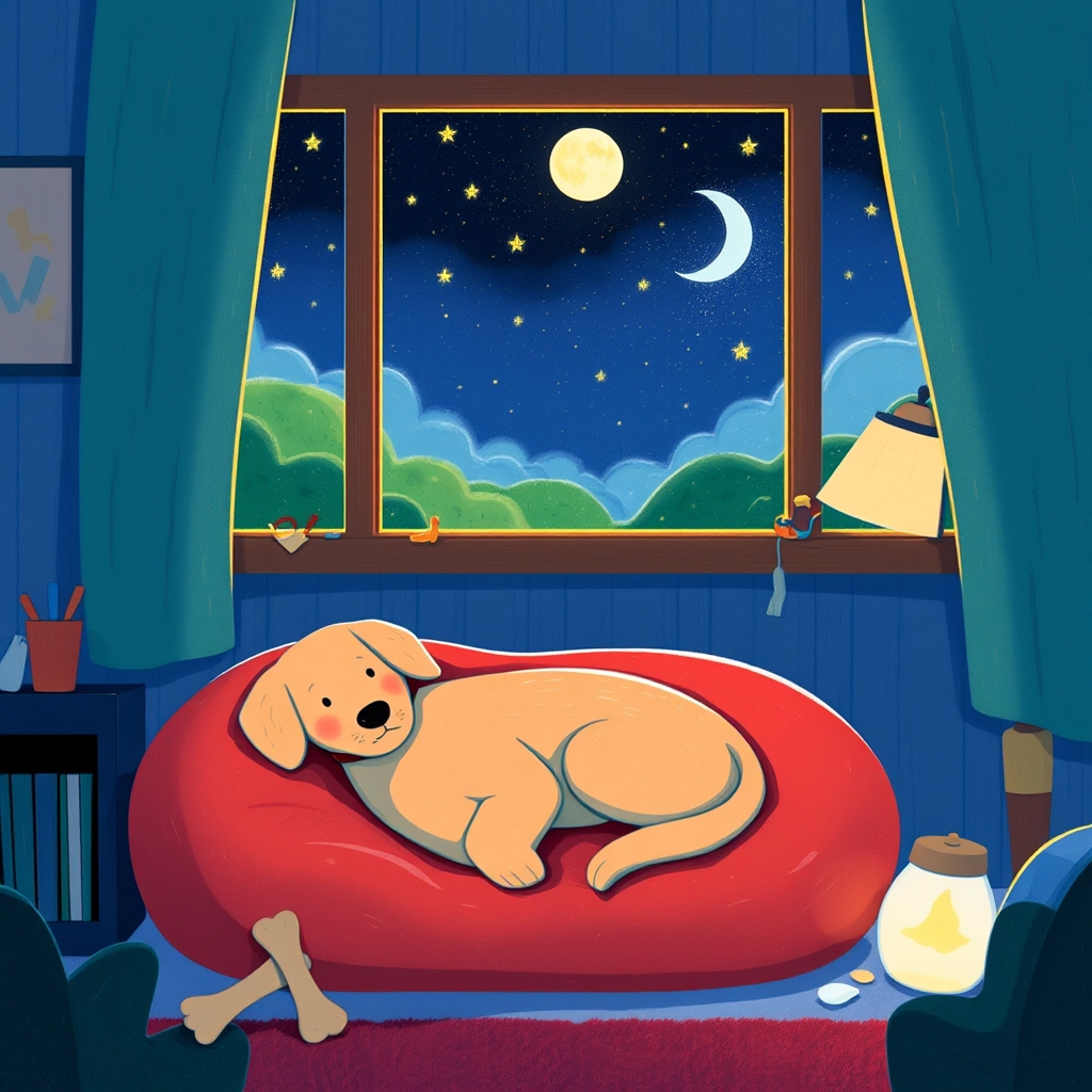 After a day full of fun, [Milo](XYMJWPQS) gets sleepy. He curls up in his favorite spot on his dog bed near the window and dreams about his next adventure.