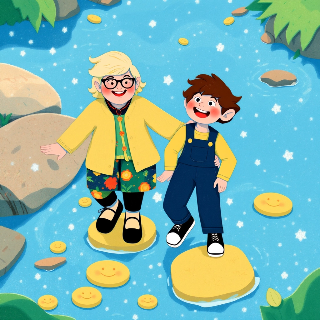 Soon, they found the Giggle River. The water sparkled and made funny giggling sounds as it flowed! They had to cross it while laughing out loud.