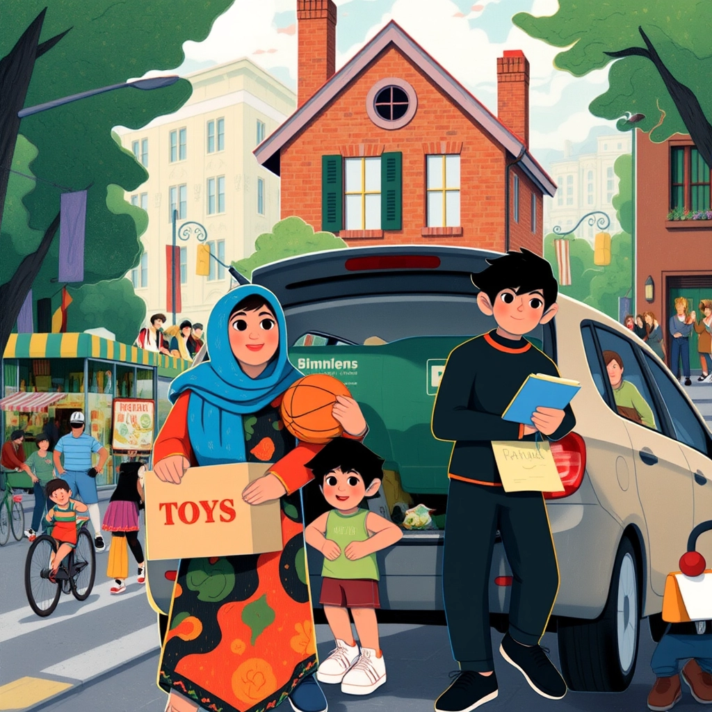 The next morning, the family decided to explore Harmony Heights. Streets buzzed with people, shops sold unique foods, and [Muhammed](CTQK5DGN)’s eyes lit up at the sight of a basketball court. But everyone seemed so different—[Fatima](9H6DLHJH) noticed many cultures and languages she hadn’t heard before.