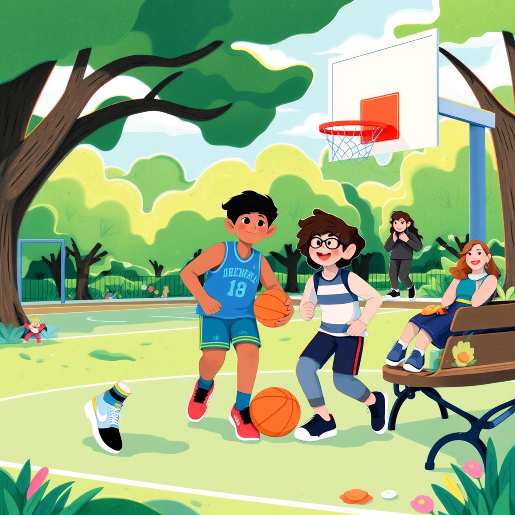 At the park, [Muhammed](CTQK5DGN) joined a basketball game. He felt shy at first, but a boy named Sam cheered him on, and soon they were passing the ball like old friends. 'You're really good at this!' Sam said, making [Muhammed](CTQK5DGN) smile from ear to ear.