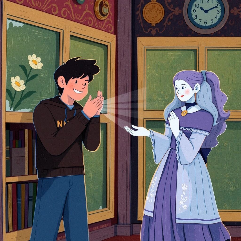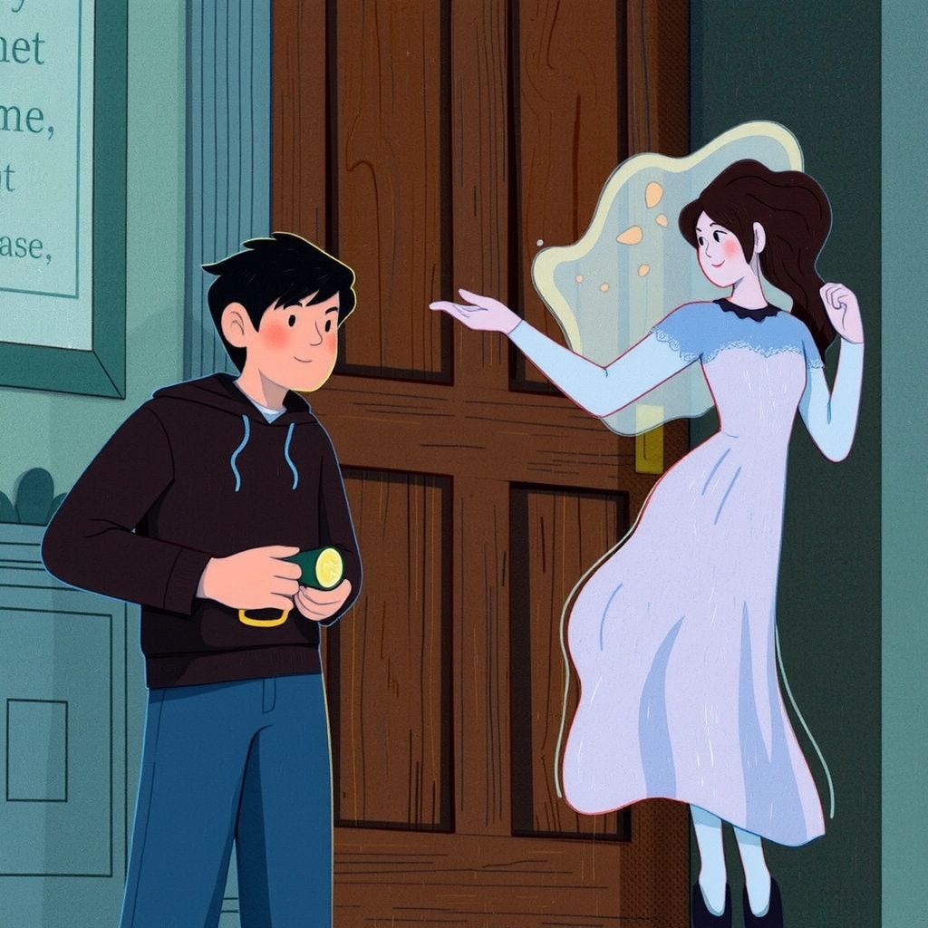 [Nguyen](2N69N5V9) noticed a book with a glowing cover—'Secrets of the Haunted House.' As he opened it, another ghost appeared, nodding with approval.