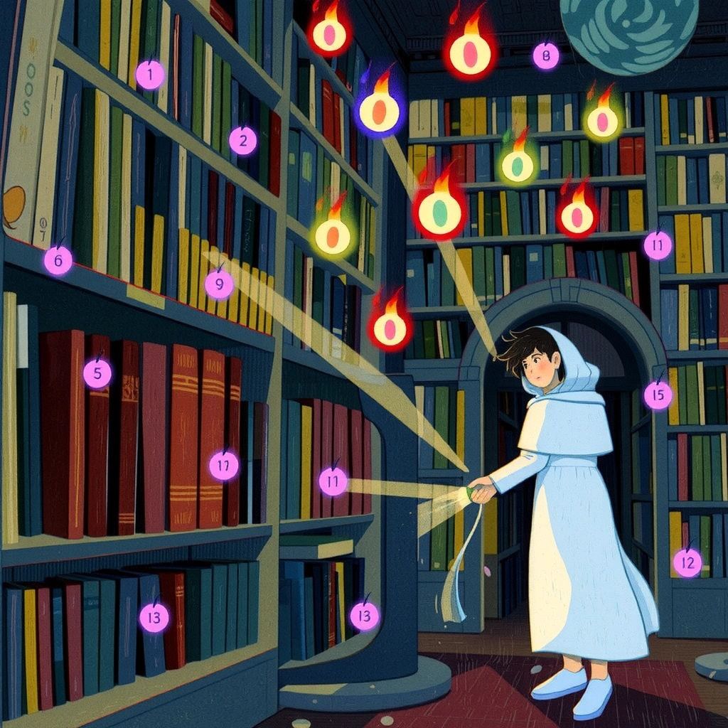 At the bottom, [Nguyen](2N69N5V9) found a dusty library filled with ancient books and glowing orbs floating above. 'The library of the forgotten,' [Lavender](BQB7NH7K) whispered.