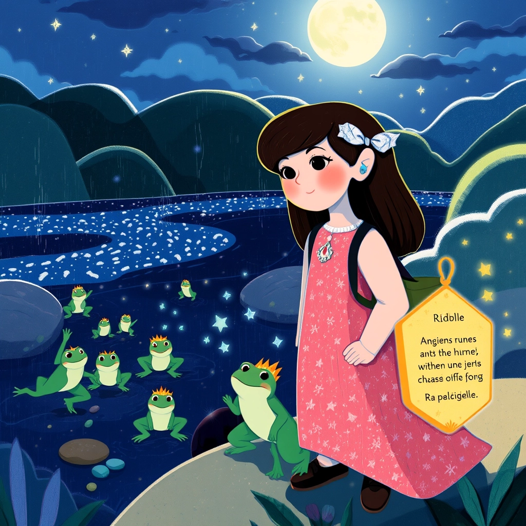 With the star flower lighting her path, [Nina](G9D2DG2N) came to a river that whispered songs. But the bridge to cross was missing! A group of dancing frogs pointed to a riddle written on a stone nearby.