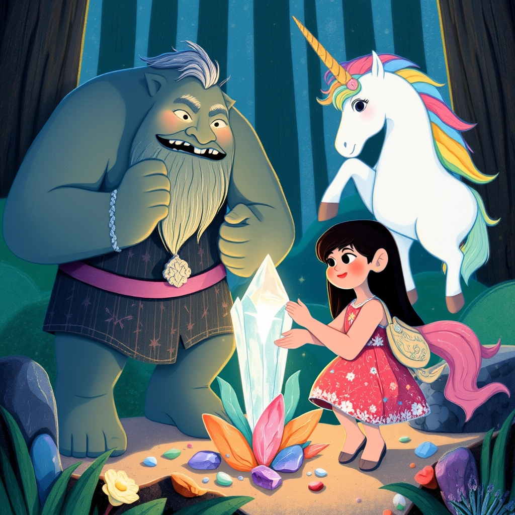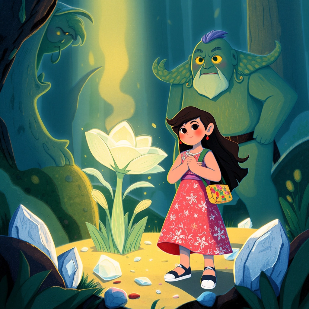 Finally, [Nina](G9D2DG2N) reached the Crystal Bloom. It sat alone in a circle of glowing stones, diamond-petaled and magical. But as she approached, a grumpy troll stood in her way. 'Who dares to take my flower?' the troll growled.