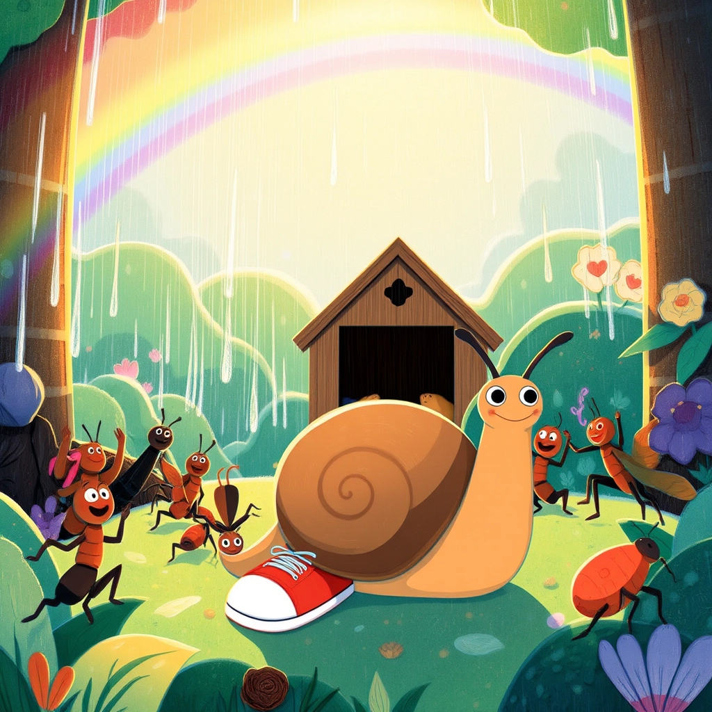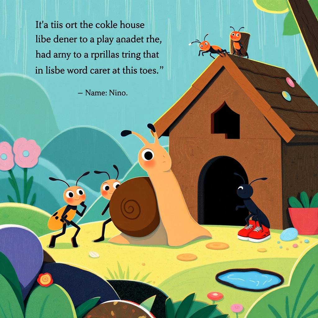 The storm passed, and the ants cheered. 'Thank you, [Nino](6HPTMBDL)! You saved us!' they said. [Nino](6HPTMBDL) just smiled. 'That’s what Super Sneaker Snails do!'