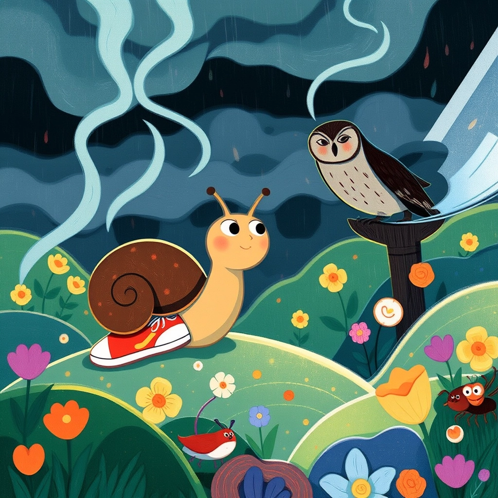 “Snails aren’t fast,” said [Olma](RXKB27WL), the wise owl, watching from her tree. But [Nino](6HPTMBDL) just laughed, 'I’m not just a snail—I’m [Nino](6HPTMBDL), the Super Sneaker Snail!'
