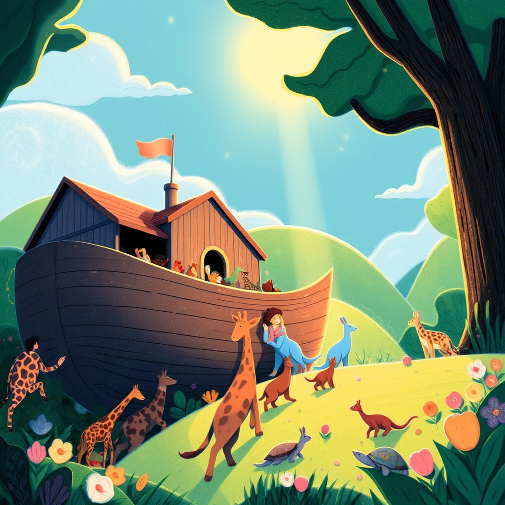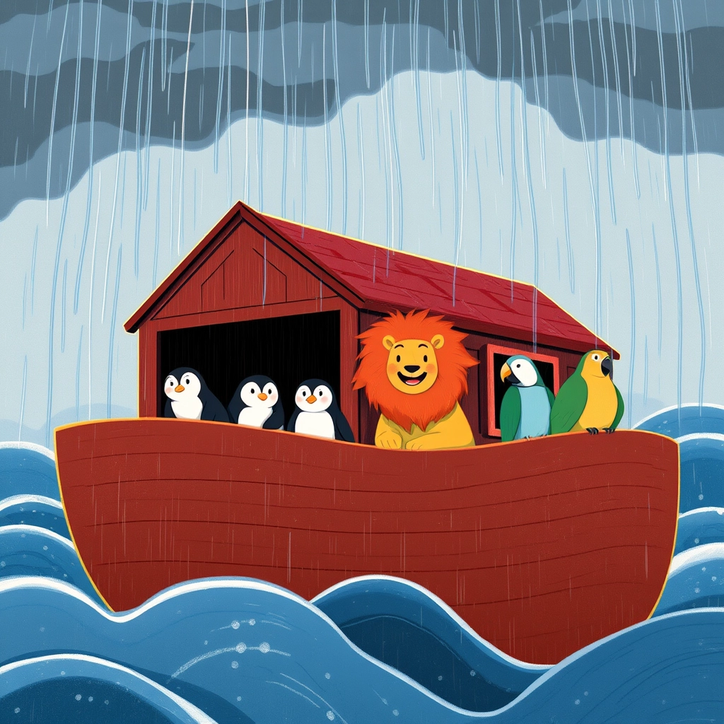 When all were aboard and safe, the sky darkened, and the rain began to pour. For forty days and nights, the ark floated on endless waters.