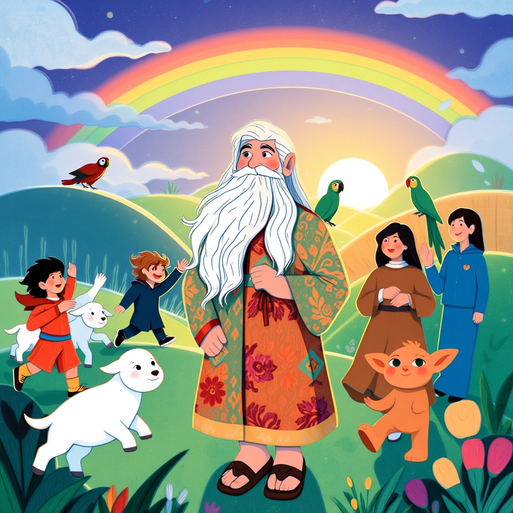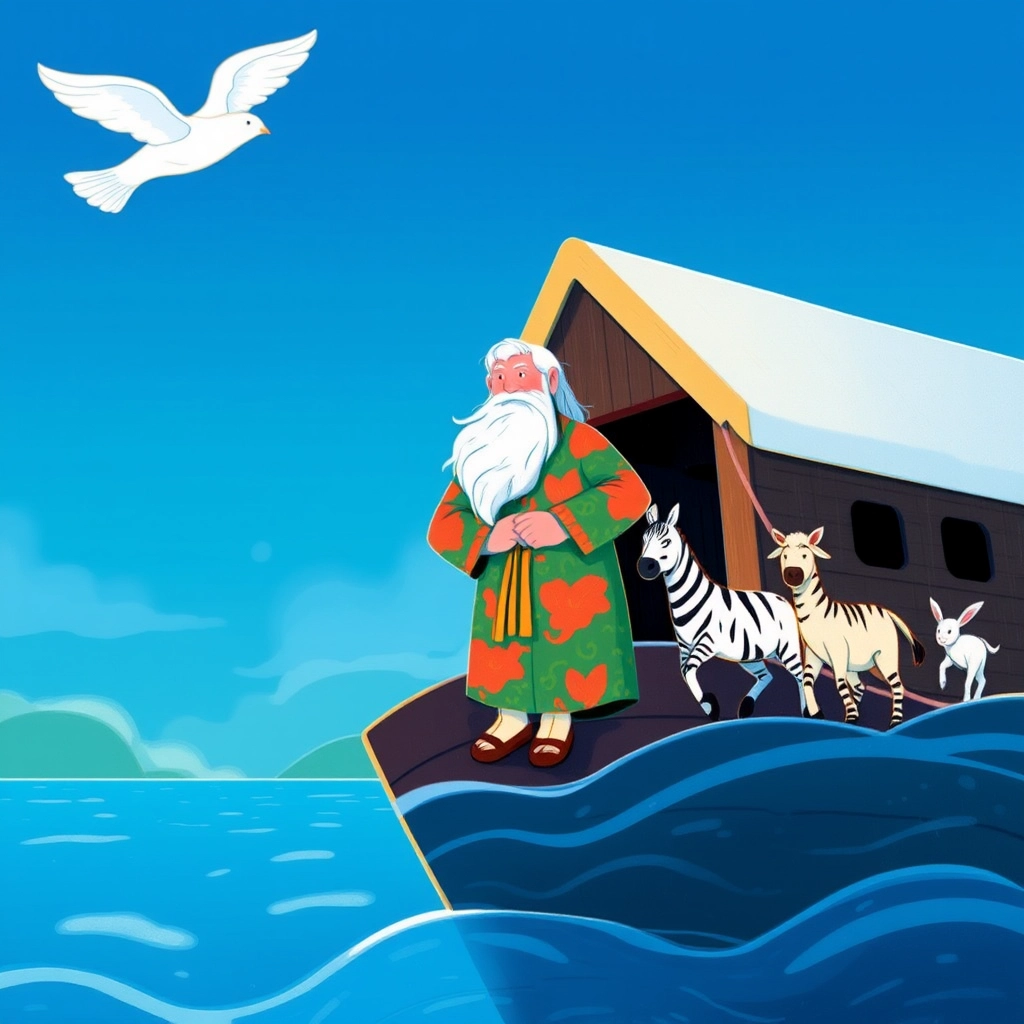 A bright rainbow stretched across the sky, promising never to flood the Earth again. [Noah](CK934T6Q) smiled as the beautiful world came alive with joy.
