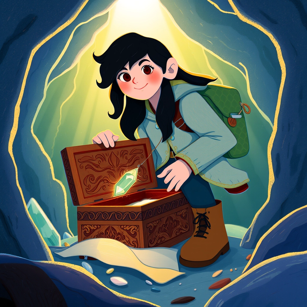The carvings seemed to tell a story. With the golden key, [Nova](7FJFZVXH) unlocked a hidden box buried beneath sparkling stones, revealing a beautiful shimmering necklace.