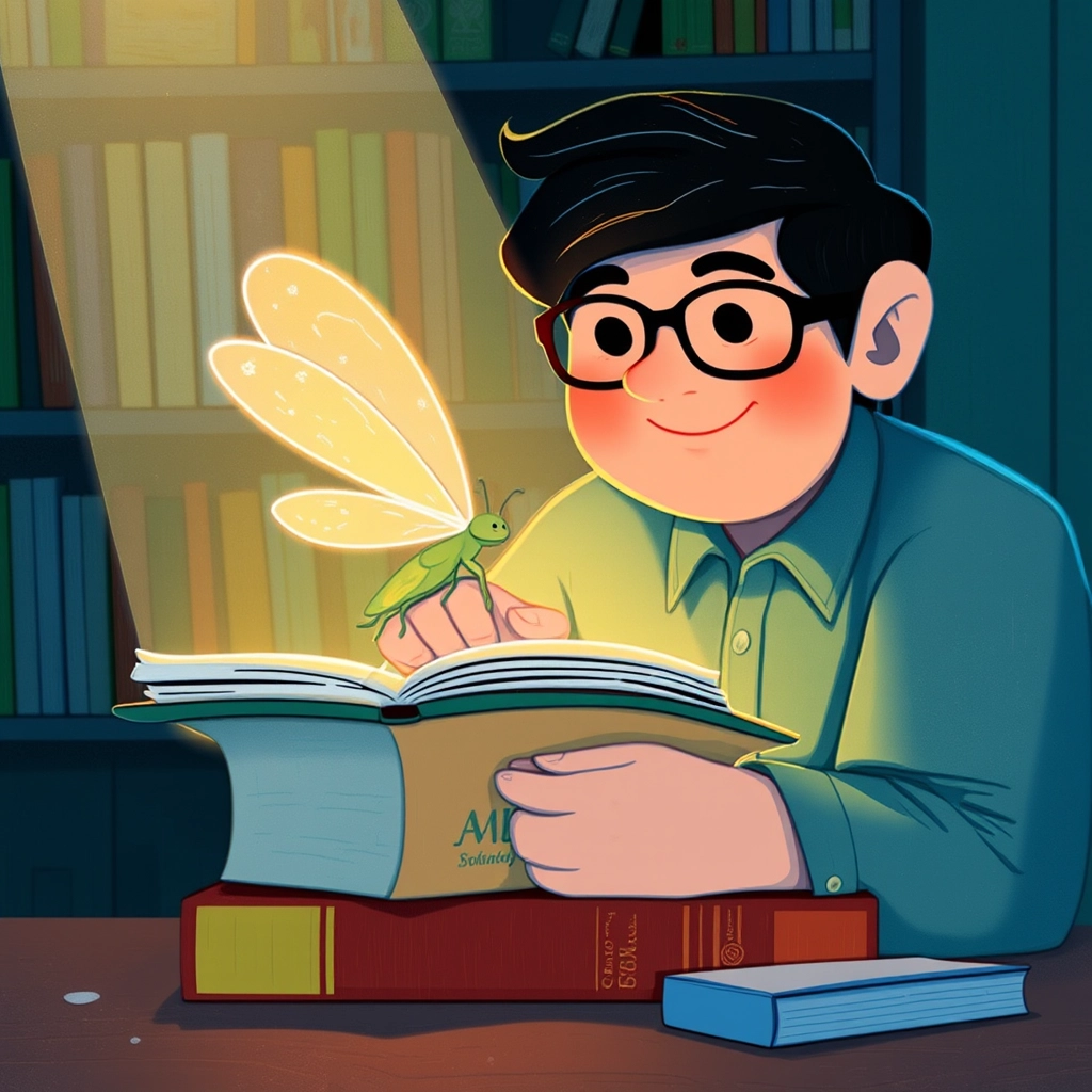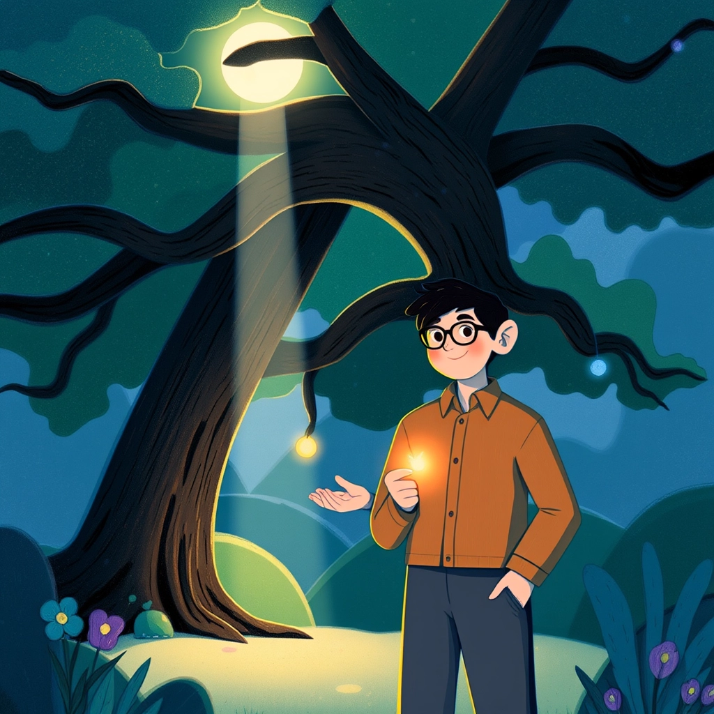 One quiet evening, while walking in the park, Eric met a bright, mischievous firefly glowing softly in the dark. ‘Hello there,’ Eric said. ‘What brings you here tonight?’