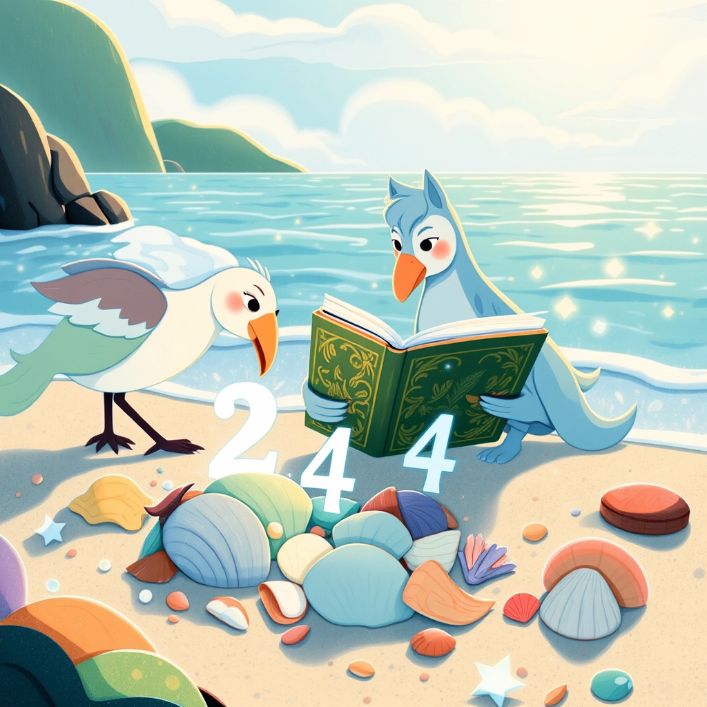 The magical book cheered as they collected the numbers 2, 3, and 4 in colorful seashells on the sandy beach.