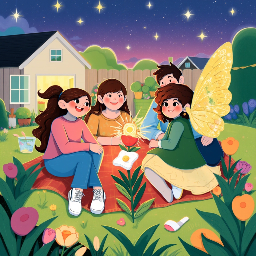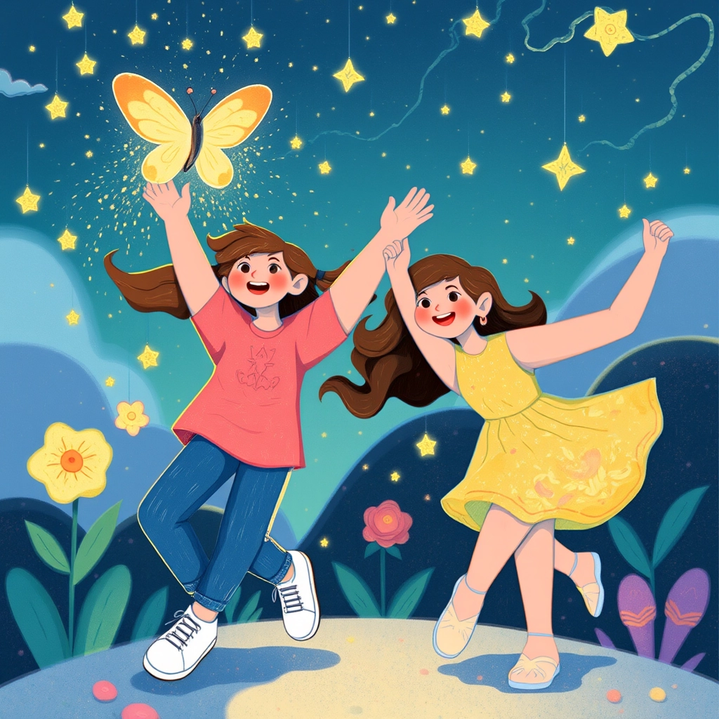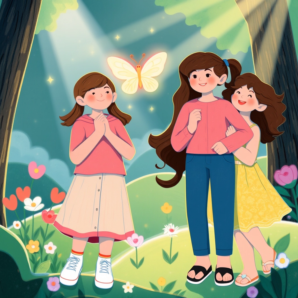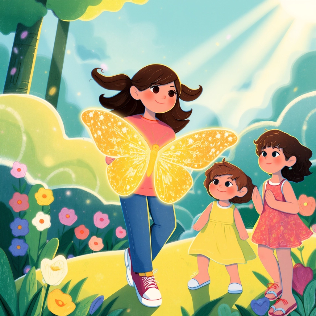 The Butterfly said, ‘Make your wish!’ [Olivia](FKVSNGH5) wished for happiness and laughter for her family, while [Simone](ZJQLBR6G) wished for endless playtime adventures.