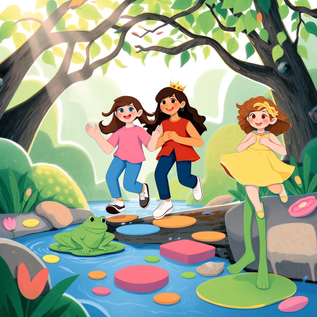 Next, they discovered a sparkling stream. A talking frog named [Sir Hopplestone](TVQ2RS7H) jumped onto a big leaf and said, ‘To cross, you must solve my riddle!’