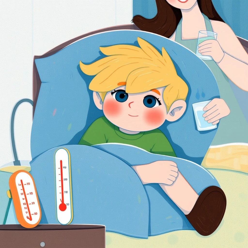 [Mum](C9JHN56X) took [Otto](Q7TBF7SL)'s temperature and decided he needed to rest at home. She tucked him into a comfy blanket and brought a bottle of water to his bedside.