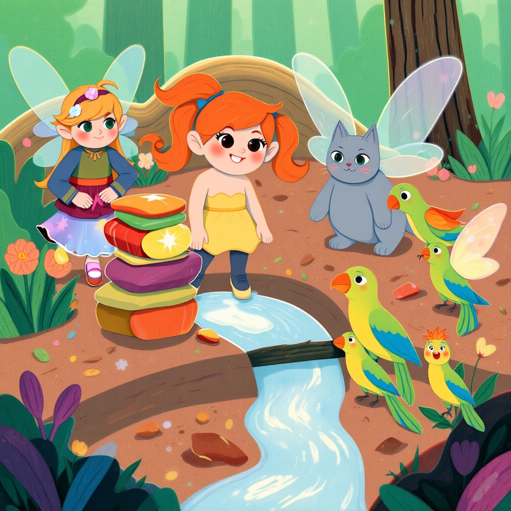 Finally, they found the source of the problem: a group of mischievous pixies blocking the stream with colorful stones. [Paige](NRP32SSV) decided to talk to them.