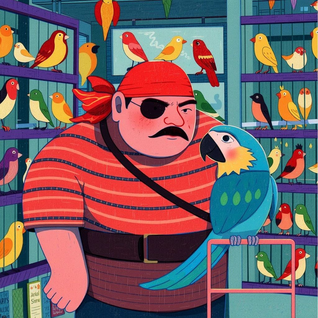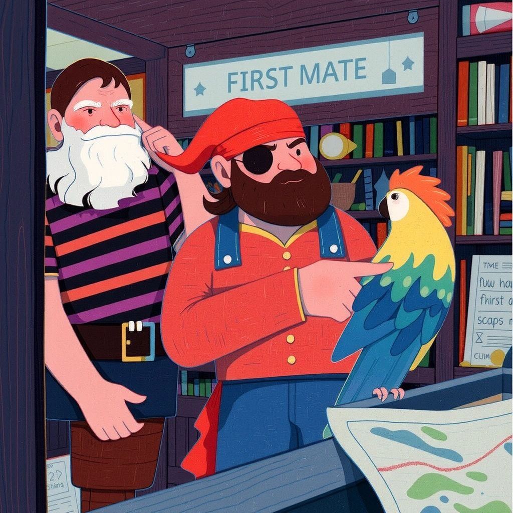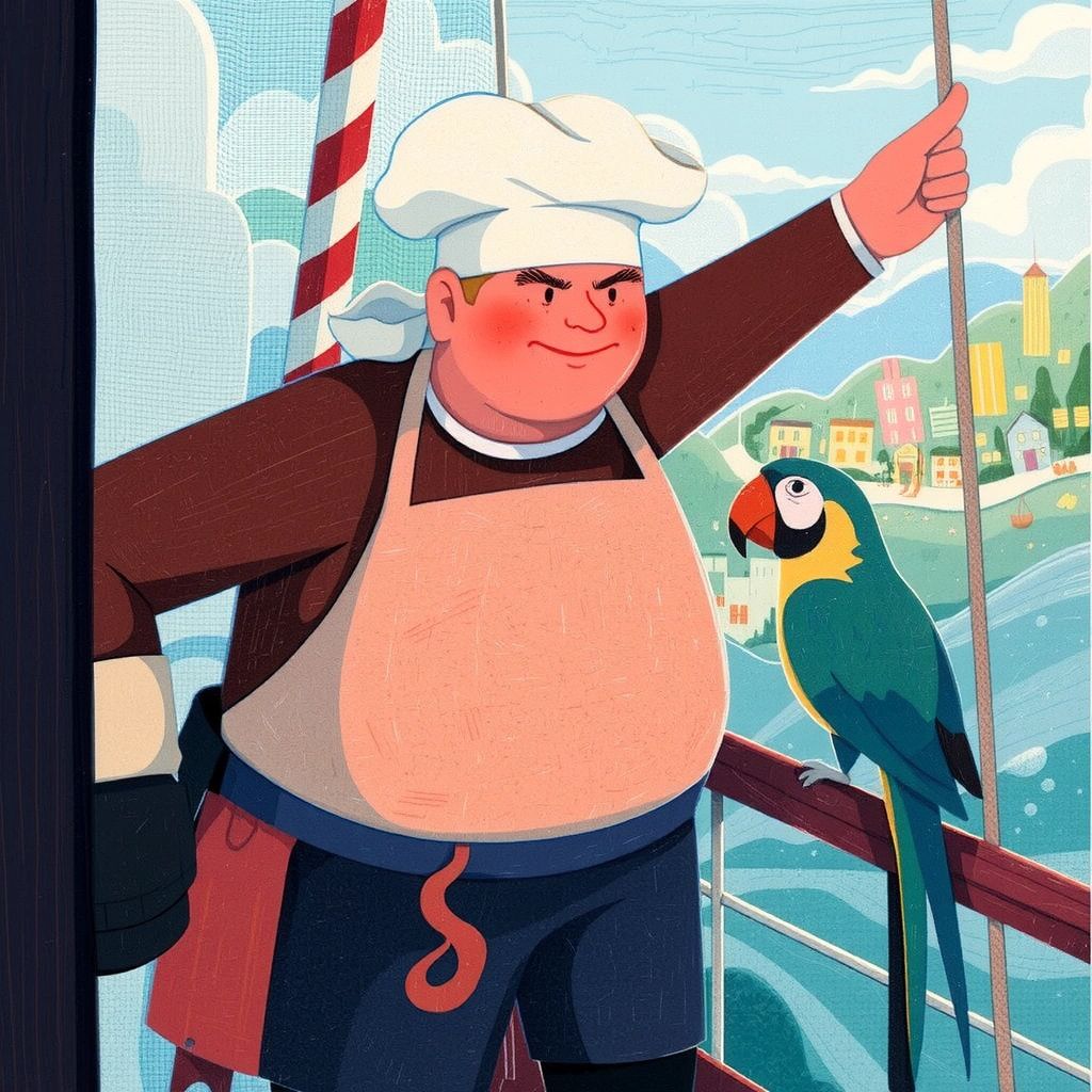 The ship's cook had a brilliant idea, ‘Why not a pet shop? It's bound to be near!’ So off they sailed to the town by the bay, In search of a parrot to brighten their day.