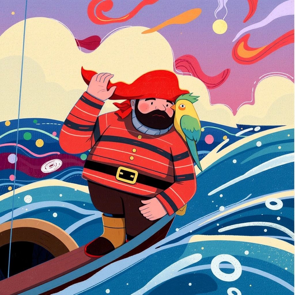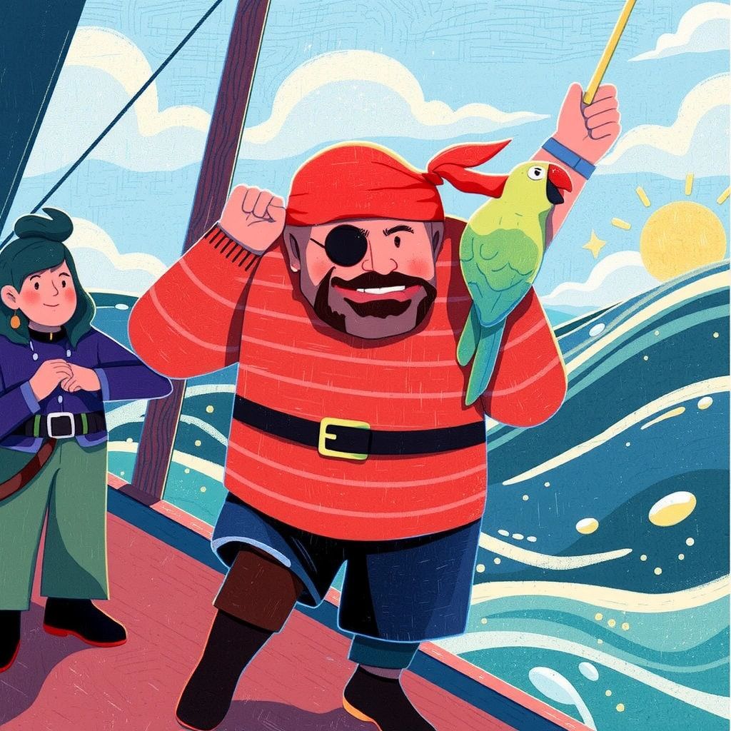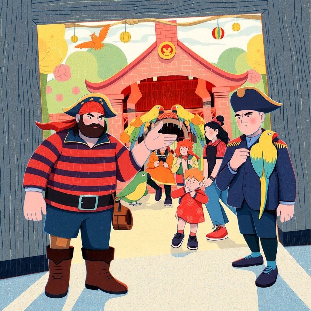 The ship's cook had a brilliant idea, ‘Why not a pet shop? It's bound to be near!’ So off they sailed to the town by the bay, In search of a parrot to brighten their day.