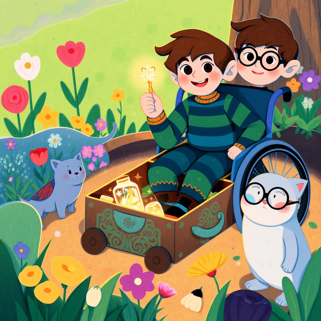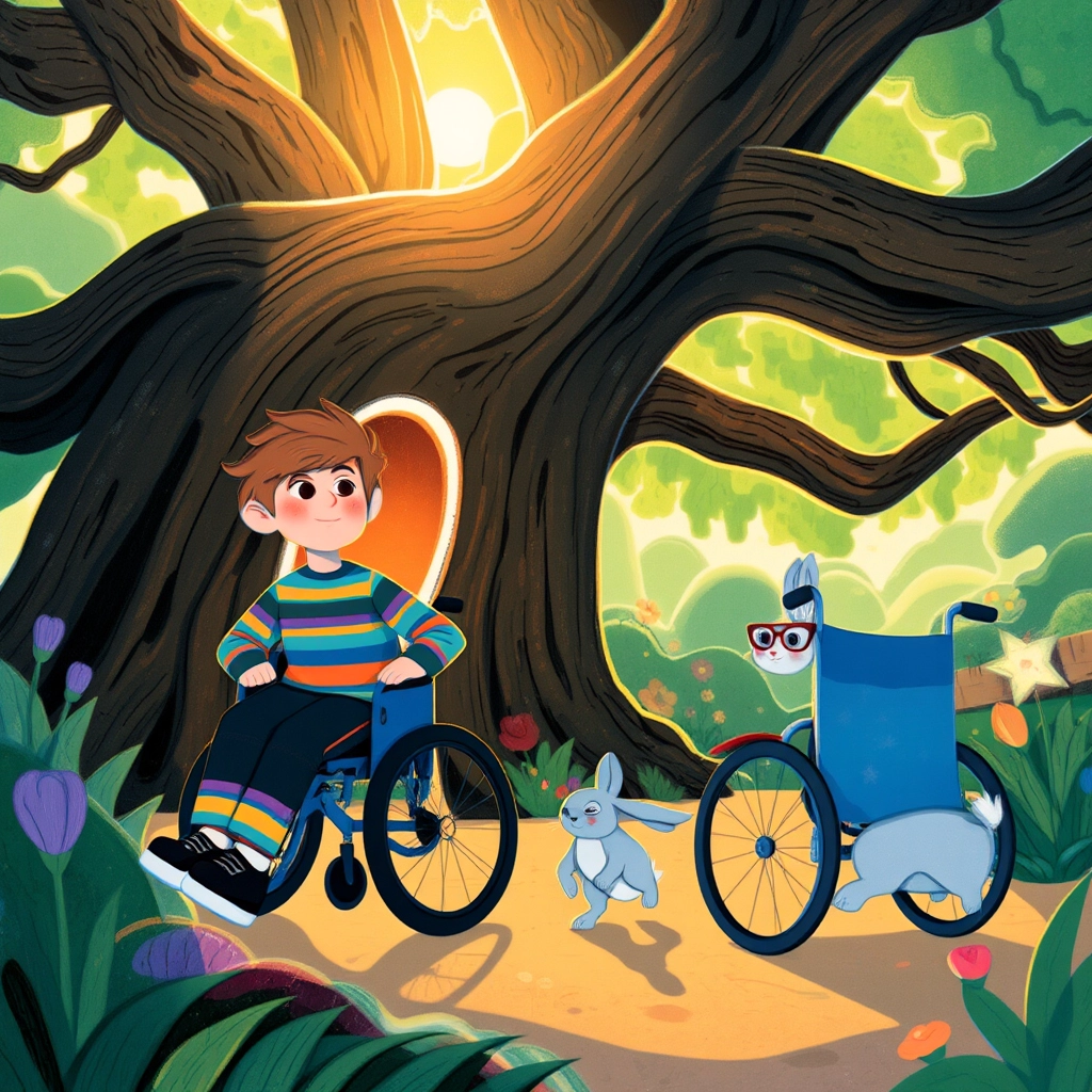 'Follow me!' [Oliver](S5ZV4ZKB) said as he hopped toward the gnarled old oak tree at the heart of the garden. [Peter](YKHGCBSG) used his wheelchair to glide smoothly behind, noticing how the tree's hollow trunk seemed to shimmer with mystery and magic.