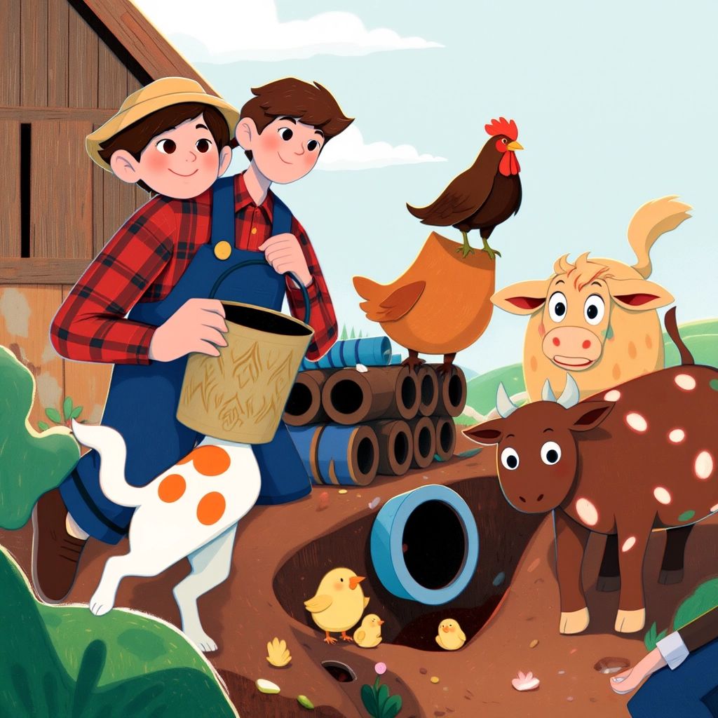 First, [Philip](4NFGGFWY) gathered old pipes and buckets. [Daisy](H9XB22P9) helped by carrying small items, [Clucky](47XCQ3XY) clucked excitedly, and [Bella](RKCPZWY6) used her strong legs to push things into place.