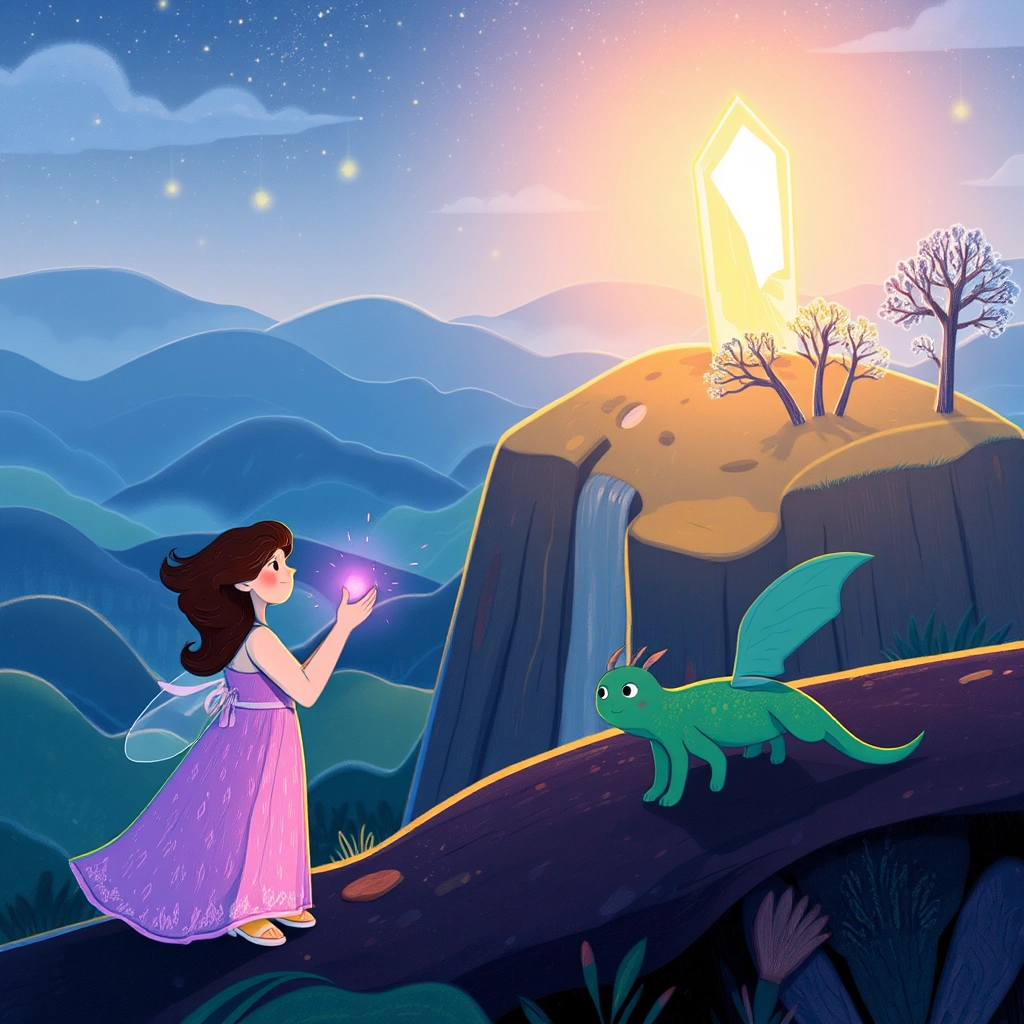 As they climbed higher and higher, the air sparkled with magic. Pixie-like lights danced around them, and the trees grew glittery silver leaves. Finally, they reached the top of Sparkle Mountain. In the center stood a giant glowing crystal that pulsed like a heartbeat, filling the air with warmth and wonder.