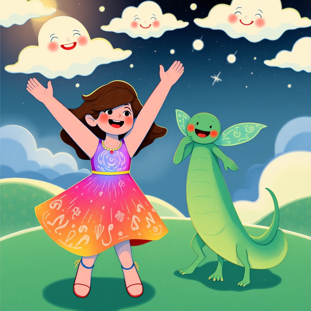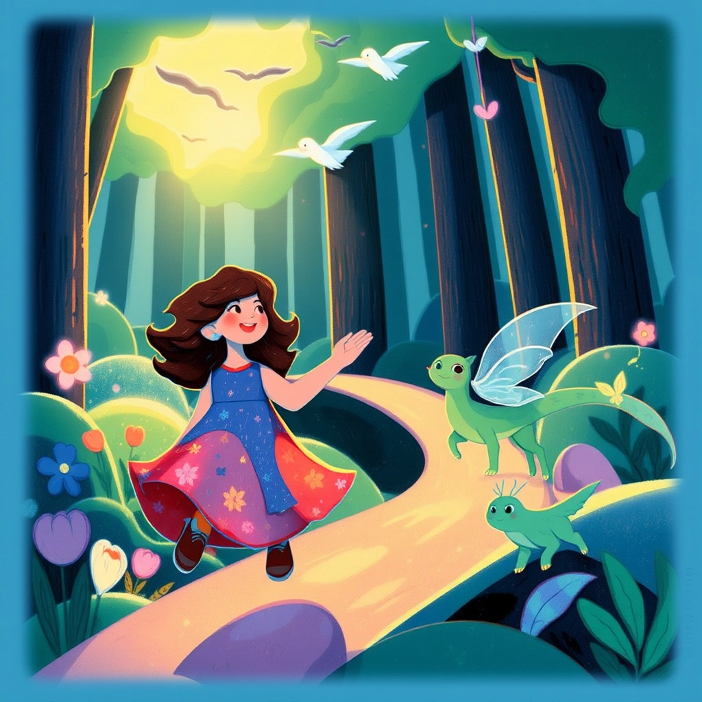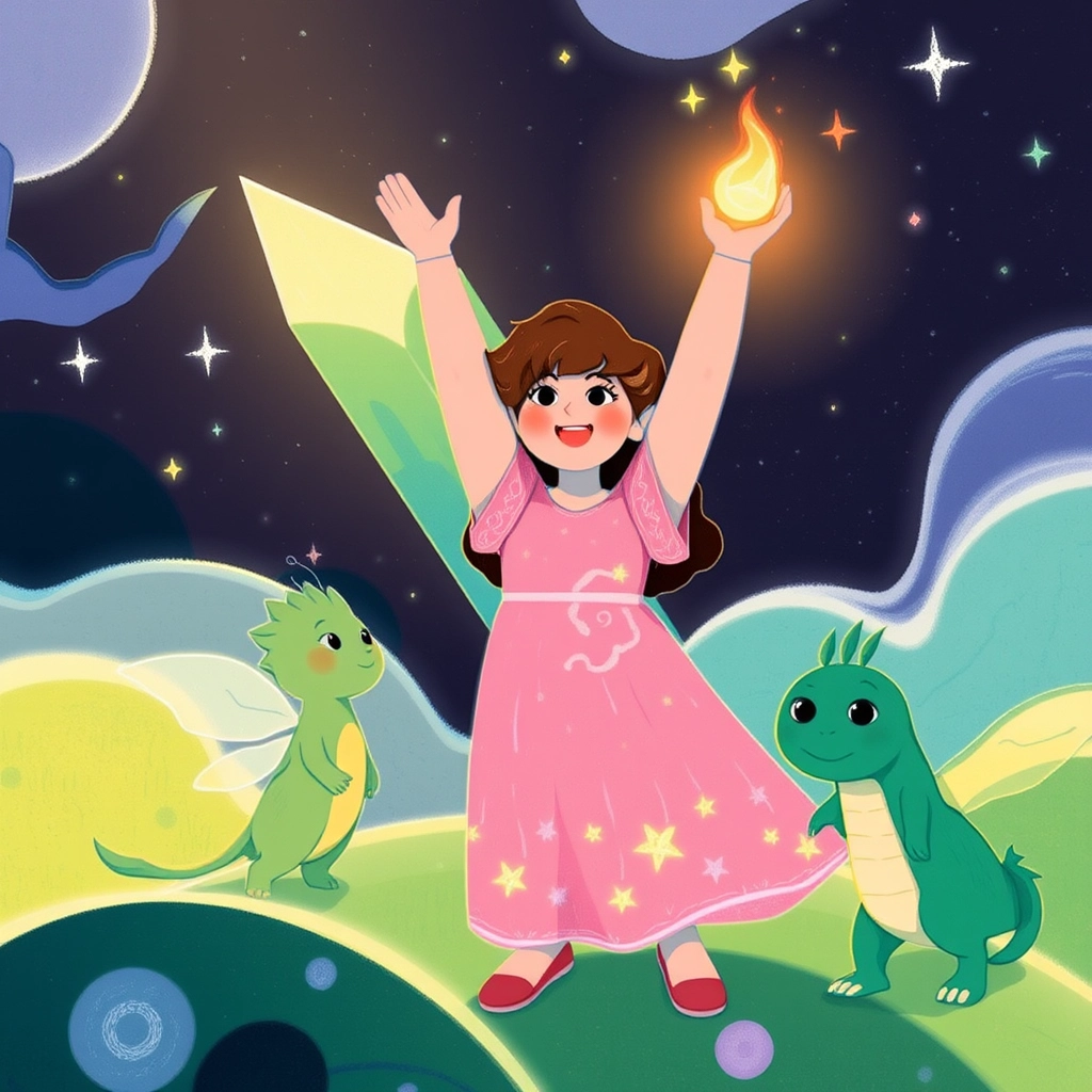 Once upon a time in the sparkling Kingdom of Everbright, there lived a cheerful princess named [Mila](9K4T33RS). [Mila](9K4T33RS) had curly hair that bounced like springs, and her magical dress changed colors to match her mood. One of her favorite things was exploring with her best friend, [Pip](LT3L7RJ9)—a tiny green dragon who was very shy.