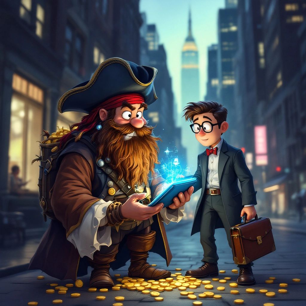 [Mr. Howard](XRHPHXNT) gave Pete a shiny new tablet and showed him how to keep track of his trades. Pete was thrilled to use such advanced tools and decided to mix his pirate skills with modern trading.