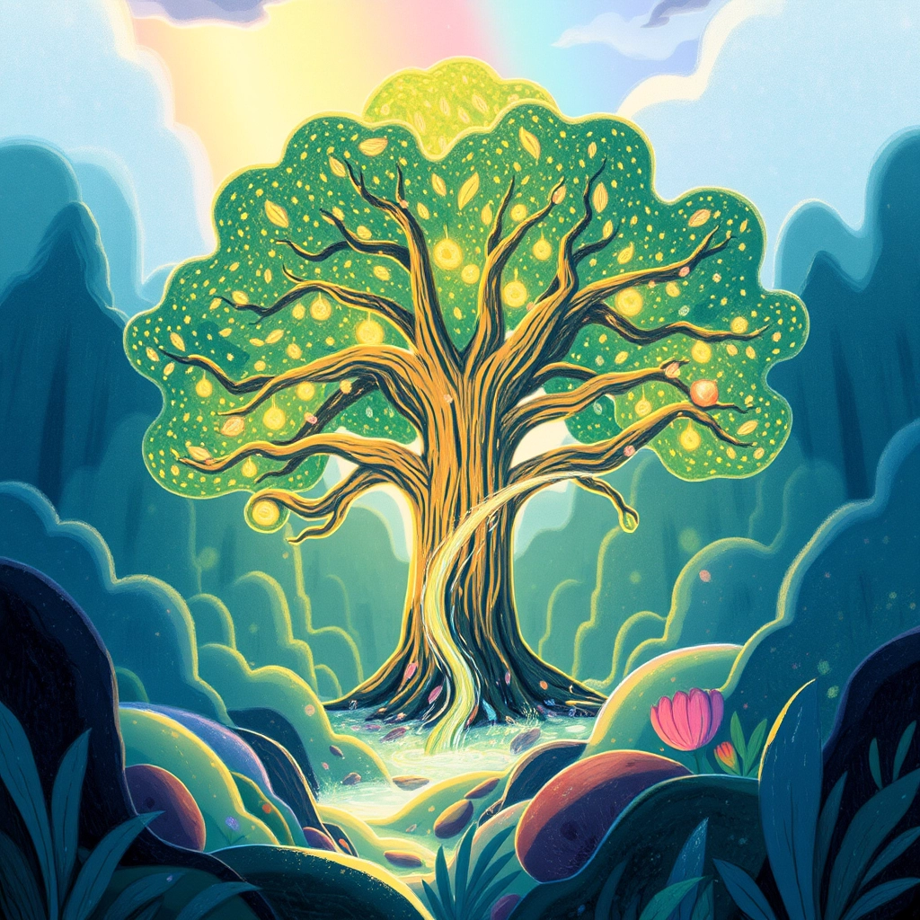 After the Mischievous Wind passed, the friends found themselves near the Glimmering Grove. The air sparkled with golden light, and the magical tree towered before them, glowing under a rainbow sky.