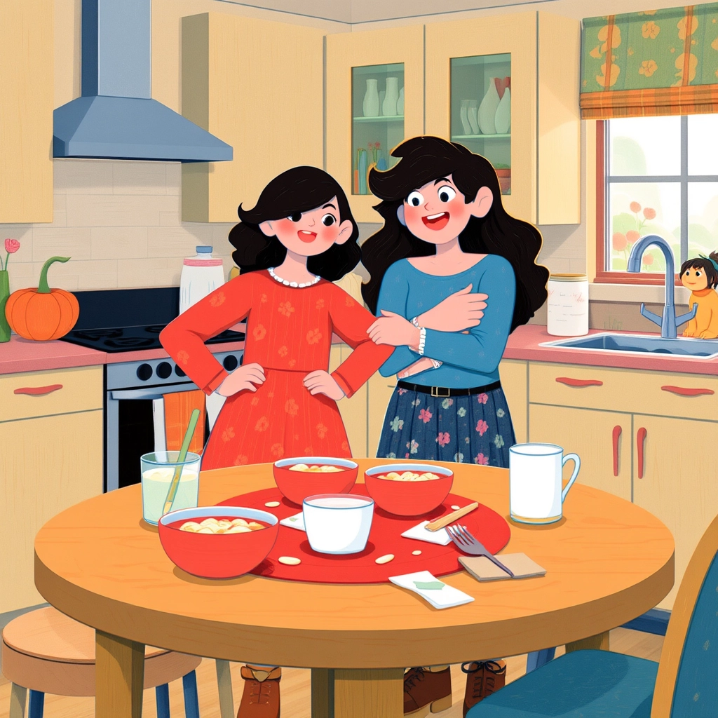 The next morning, Popo decided to surprise her mom by packing her own school bag and setting the breakfast table. Though it wasn’t perfect, Rozi was impressed with her effort and gave her a big hug.