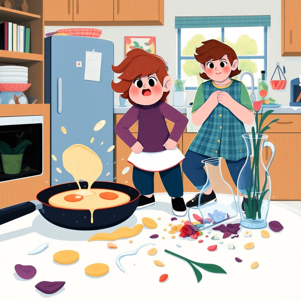 “Popo, stop that this instant!” Rozi called as she flipped a pancake. But by then, Popo had already knocked over a vase, sending flowers and water everywhere. ‘Oops!’ Popo said, giggling. Rozi sighed, knowing it was going to be a long day.
