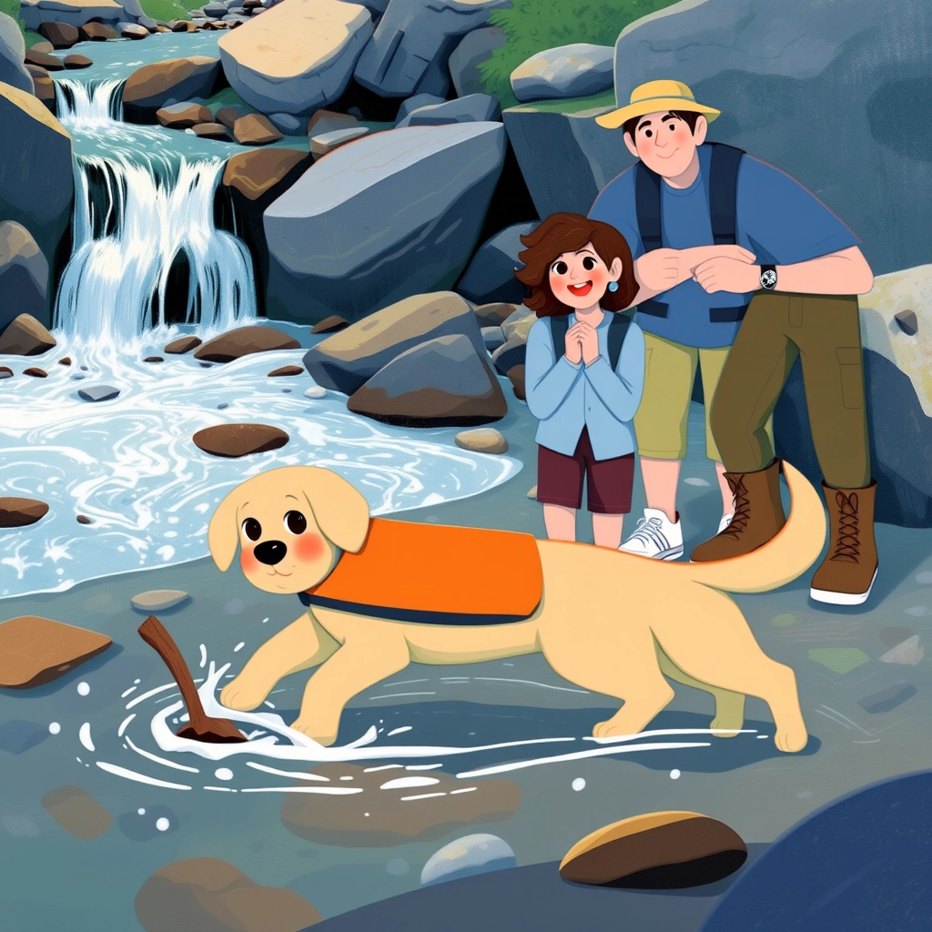 Soon, they came to a sparkling stream. ‘Look, [Poppy](4YQS732B)!’ said [Dad](DYJTFPQF), throwing a stick. ‘Fetch!’ But before jumping in, [Mum](QLHF3Q94) put [Poppy](4YQS732B)’s little life vest on her.