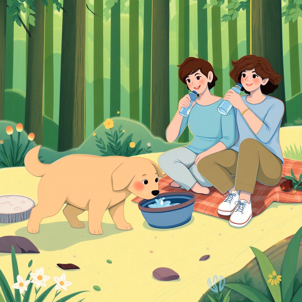 As they walked further, the sun grew warmer. 'Let’s rest and drink some water,' said [Mum](QLHF3Q94). [Poppy](4YQS732B) happily slurped her water from a travel bowl.